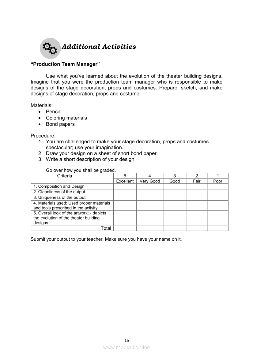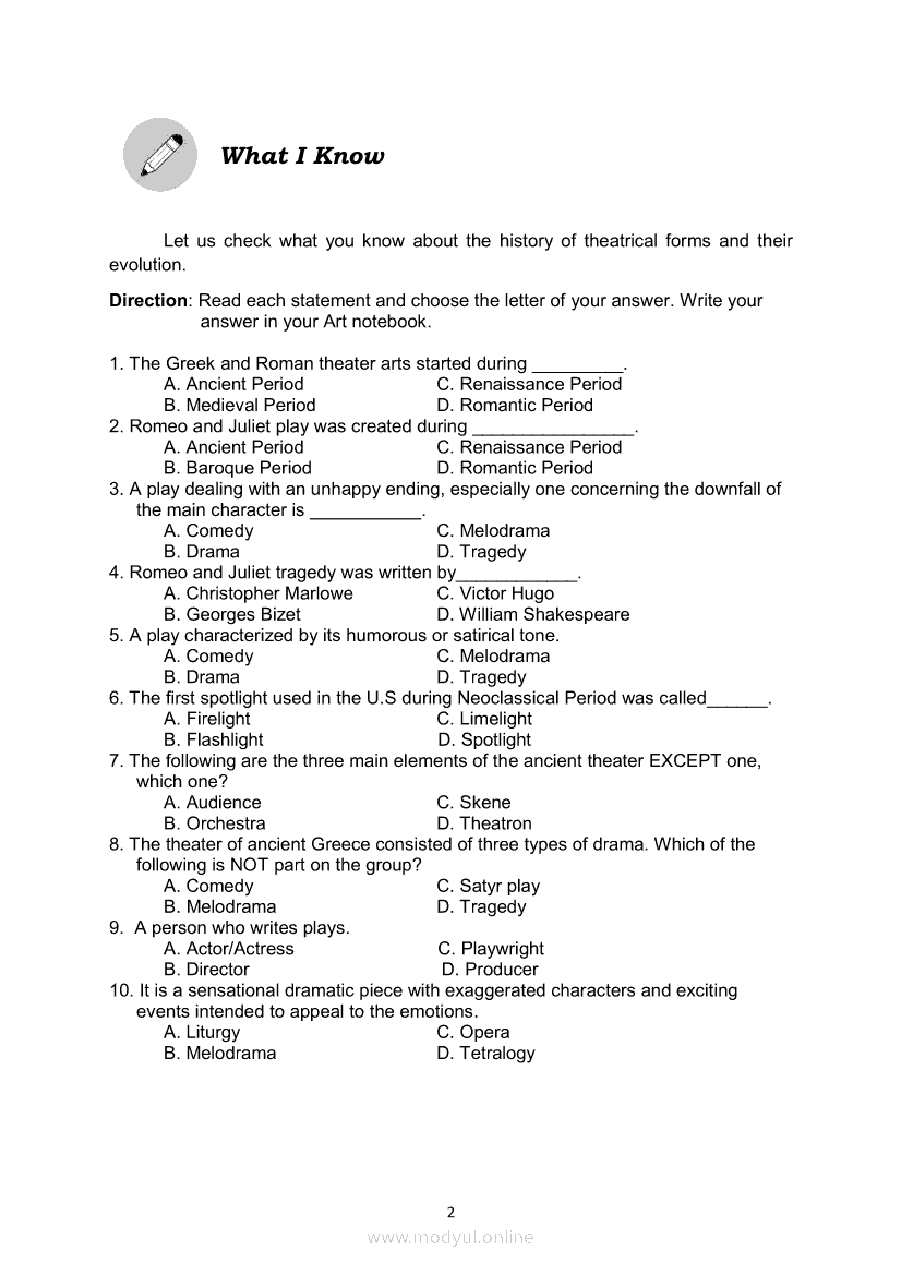 ARTS Quarter 4 – Module 4a: History of the Theatrical Forms and their EvolutionMay 28, 2021 Grade 9Xiaomi Redmi Watch 5 Active 2inch LCD Display Clear Calling 5ATM Waterproof Smart Watch for only ₱3,999 ₱1,200!. Arts 9 4th QuarterRelatedARTS Quarter 4 – Module 4b: Western Classical Plays/Opera and Famous Filipino Playwrights and DirectorsTLE-IA-AUTOMOTIVE SERVICING NC 1 Quarter 4 – Module 1,2,3&4 FOUR STROKE CYCLE ENGINESEdukasyon sa Pagpapakatao Ikaapat na Markahan- Modyul 2: Mga Pansariling Salik sa Pagpili ng Track o Kursong Akademik, Teknikal-Bokasyonal, Sining at Disenyo, at Isports. (Ikalawang Linggo)English Quarter 4 – Module 1: Judge the Relevance and Worth of Ideas, Soundness of Author’s Reasoning, and the Effectiveness of the PresentationTLE-Animal Production Quarter 4 – Module 6: Keeping Records of Layers