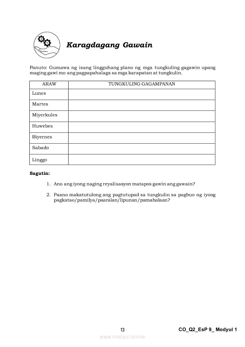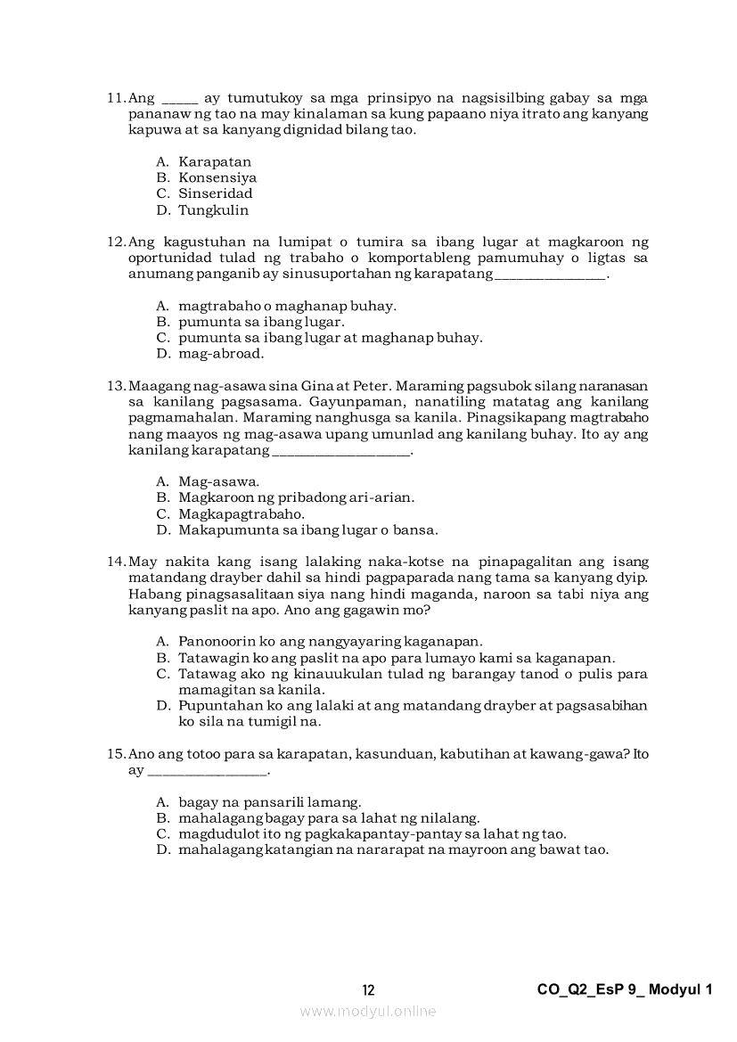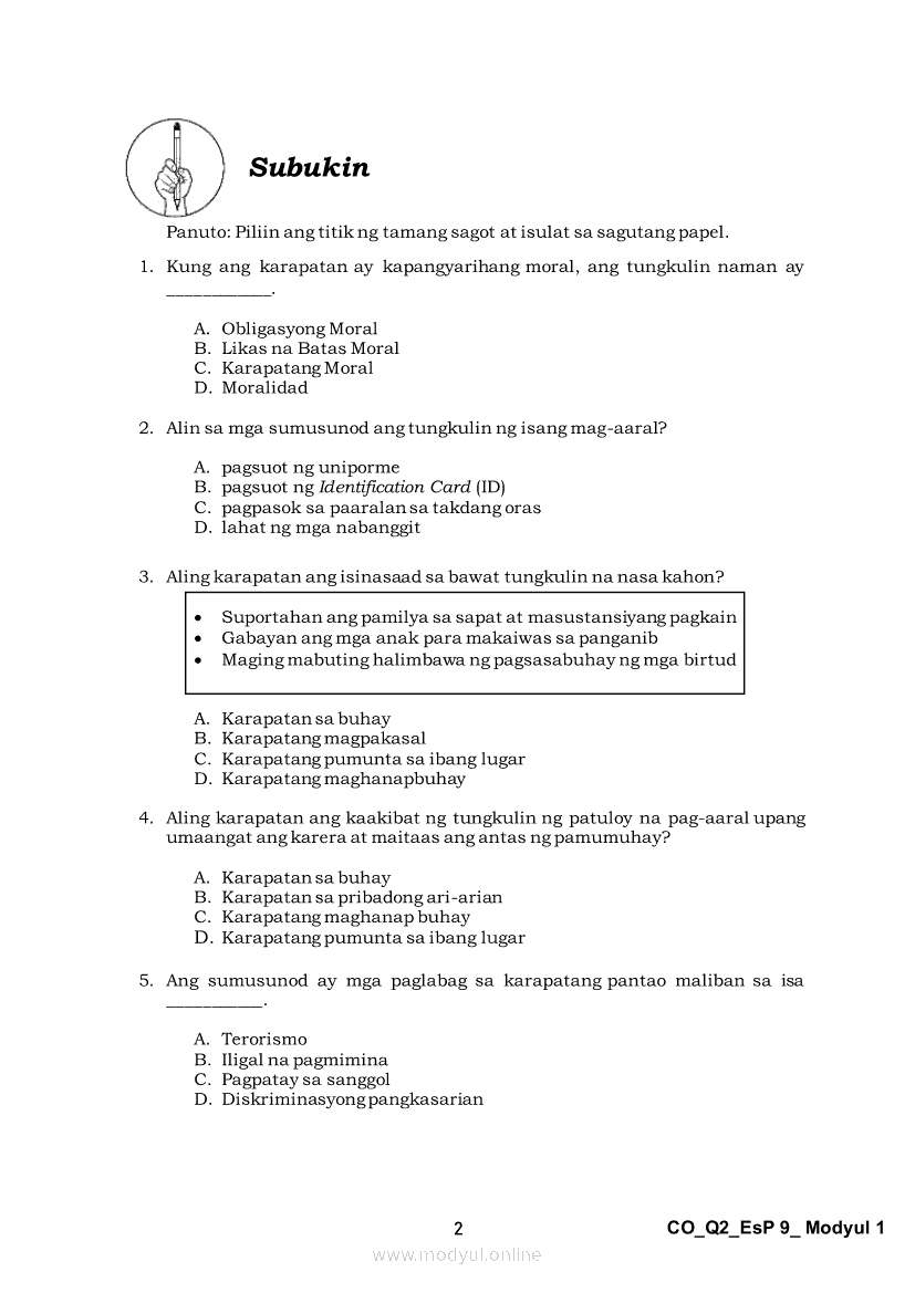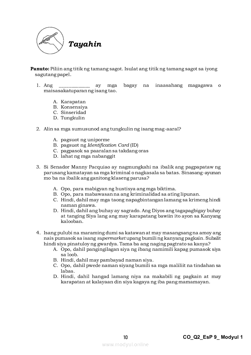 Edukasyon sa Pagpapakatao 9 Ikalawang Markahan – Modyul 1: Karapatan at Tungkulin ng TaoApr 22, 2021 Grade 9Xiaomi Redmi Watch 5 Active 2inch LCD Display Clear Calling 5ATM Waterproof Smart Watch for only ₱3,999 ₱1,200!. Edukasyon sa Pagpapakatao 9RelatedEdukasyon sa Pagpapakatao Ikaapat na Markahan- Modyul 2: Mga Pansariling Salik sa Pagpili ng Track o Kursong Akademik, Teknikal-Bokasyonal, Sining at Disenyo, at Isports. (Ikalawang Linggo)Edukasyon sa Pagpapakatao Ikaapat na Markahan – Modyul 3: Personal na Pahayag ng Misyon sa Buhay (Ikatlong Linggo)Edukasyon sa Pagpapakatao Ikaapat na Markahan – Modyul 4: Personal na Pahayag ng Misyon sa Buhay (Ikaapat na Linggo)Edukasyon sa Pagpapakatao Ikaapat na Markahan- Modyul 1: Mga Pansariling Salik sa Pagpili ng Track o Kursong Akademik, Teknikal-Bokasyonal, Sining at Disenyo, at Isports. (Unang Linggo)Edukasyon sa Pagpapakatao 9 Ikalawang Markahan – Modyul 3: Ang Paggawa Bilang Paglilingkod at Pagtaguyod ng Dignidad ng Tao