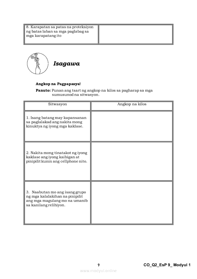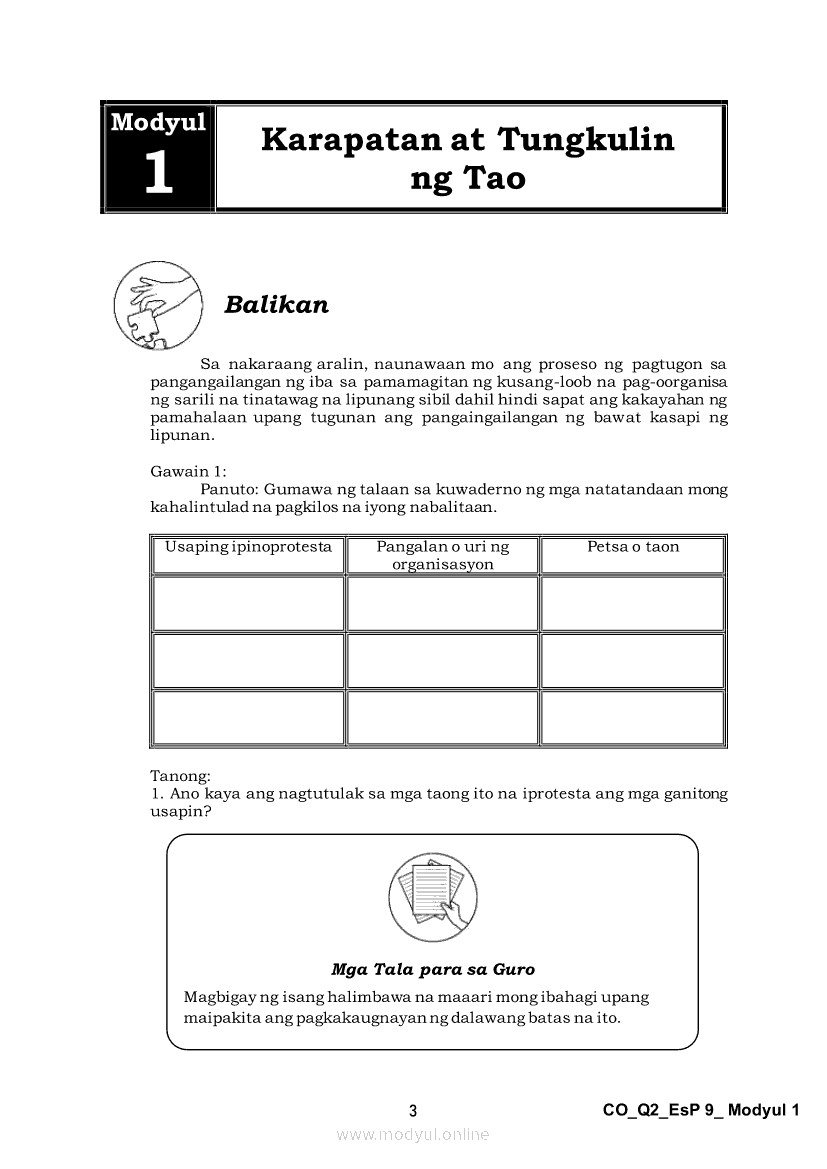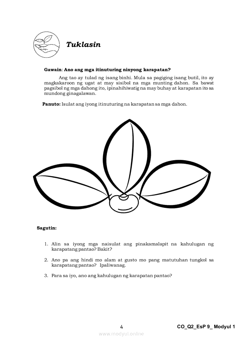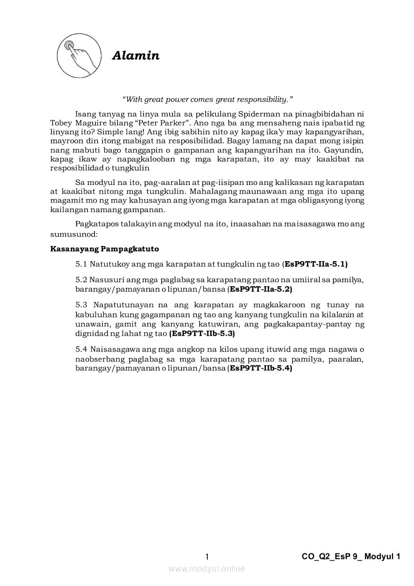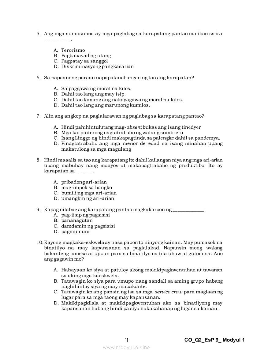 Edukasyon sa Pagpapakatao 9 Ikalawang Markahan – Modyul 1: Karapatan at Tungkulin ng TaoApr 22, 2021 Grade 9Xiaomi Redmi Watch 5 Active 2inch LCD Display Clear Calling 5ATM Waterproof Smart Watch for only ₱3,999 ₱1,200!. Edukasyon sa Pagpapakatao 9RelatedEdukasyon sa Pagpapakatao Ikaapat na Markahan- Modyul 2: Mga Pansariling Salik sa Pagpili ng Track o Kursong Akademik, Teknikal-Bokasyonal, Sining at Disenyo, at Isports. (Ikalawang Linggo)Edukasyon sa Pagpapakatao Ikaapat na Markahan – Modyul 3: Personal na Pahayag ng Misyon sa Buhay (Ikatlong Linggo)Edukasyon sa Pagpapakatao Ikaapat na Markahan – Modyul 4: Personal na Pahayag ng Misyon sa Buhay (Ikaapat na Linggo)Edukasyon sa Pagpapakatao Ikaapat na Markahan- Modyul 1: Mga Pansariling Salik sa Pagpili ng Track o Kursong Akademik, Teknikal-Bokasyonal, Sining at Disenyo, at Isports. (Unang Linggo)Edukasyon sa Pagpapakatao 9 Ikalawang Markahan – Modyul 3: Ang Paggawa Bilang Paglilingkod at Pagtaguyod ng Dignidad ng Tao