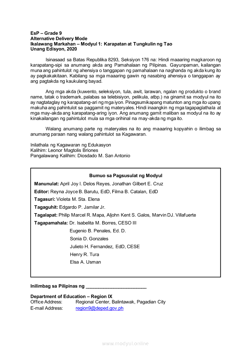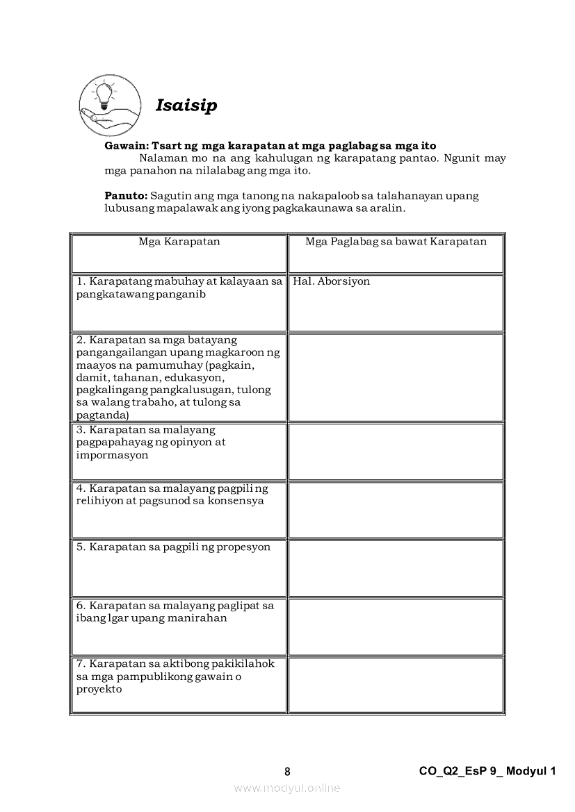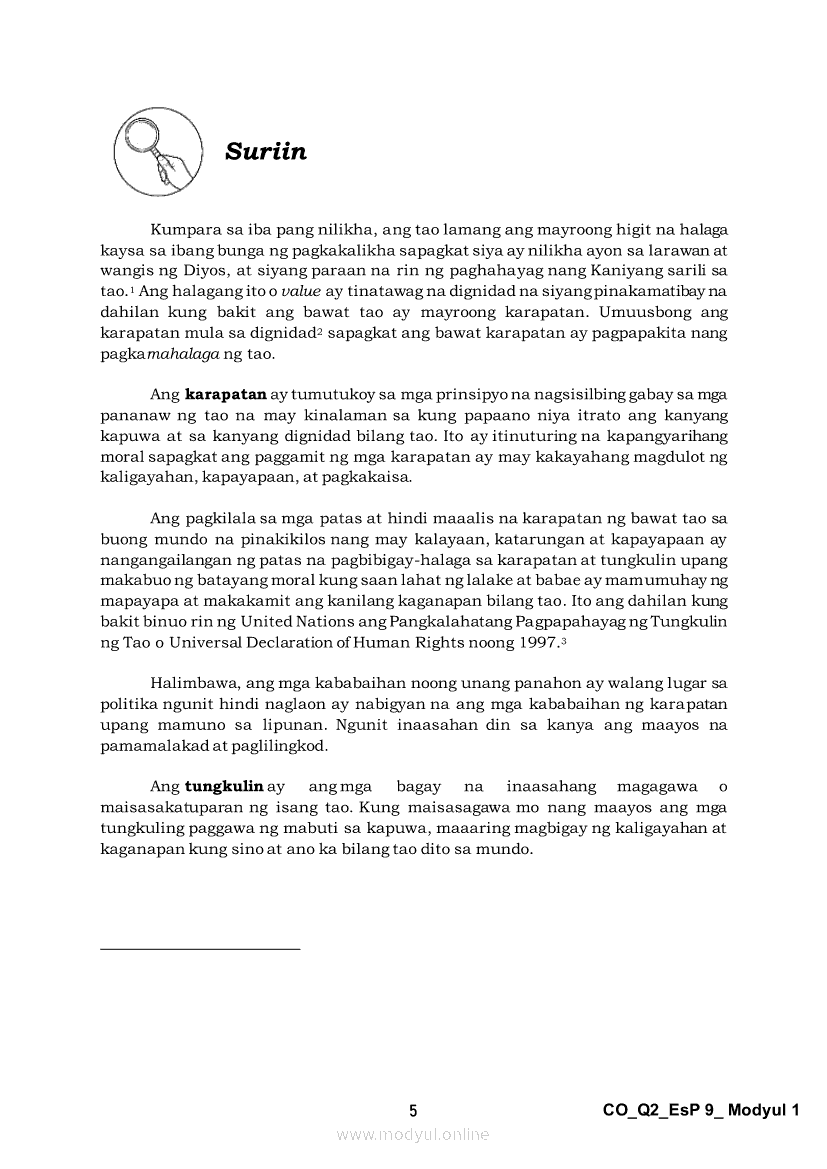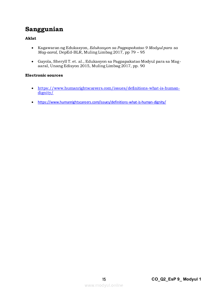 Edukasyon sa Pagpapakatao 9 Ikalawang Markahan – Modyul 1: Karapatan at Tungkulin ng TaoApr 22, 2021 Grade 9Xiaomi Redmi Watch 5 Active 2inch LCD Display Clear Calling 5ATM Waterproof Smart Watch for only ₱3,999 ₱1,200!. Edukasyon sa Pagpapakatao 9RelatedEdukasyon sa Pagpapakatao Ikaapat na Markahan- Modyul 2: Mga Pansariling Salik sa Pagpili ng Track o Kursong Akademik, Teknikal-Bokasyonal, Sining at Disenyo, at Isports. (Ikalawang Linggo)Edukasyon sa Pagpapakatao Ikaapat na Markahan – Modyul 3: Personal na Pahayag ng Misyon sa Buhay (Ikatlong Linggo)Edukasyon sa Pagpapakatao Ikaapat na Markahan – Modyul 4: Personal na Pahayag ng Misyon sa Buhay (Ikaapat na Linggo)Edukasyon sa Pagpapakatao Ikaapat na Markahan- Modyul 1: Mga Pansariling Salik sa Pagpili ng Track o Kursong Akademik, Teknikal-Bokasyonal, Sining at Disenyo, at Isports. (Unang Linggo)Edukasyon sa Pagpapakatao 9 Ikalawang Markahan – Modyul 3: Ang Paggawa Bilang Paglilingkod at Pagtaguyod ng Dignidad ng Tao