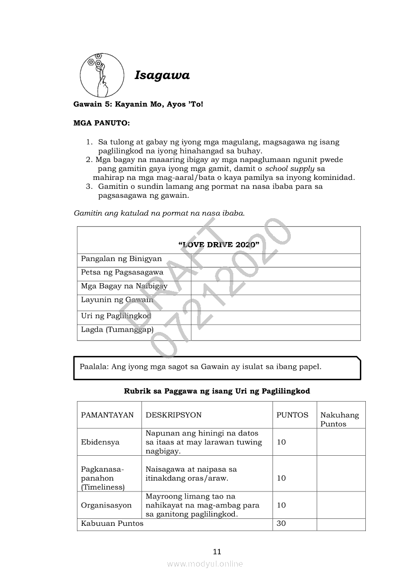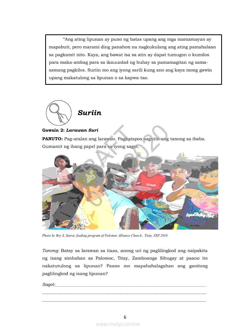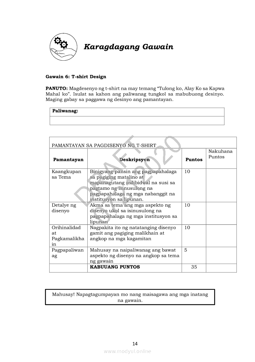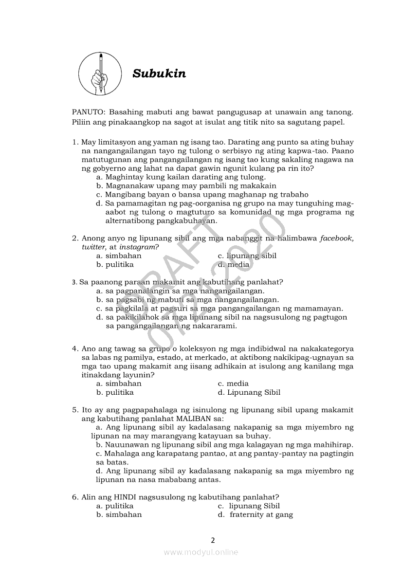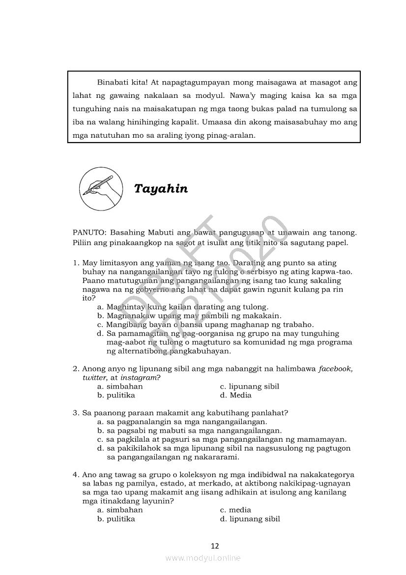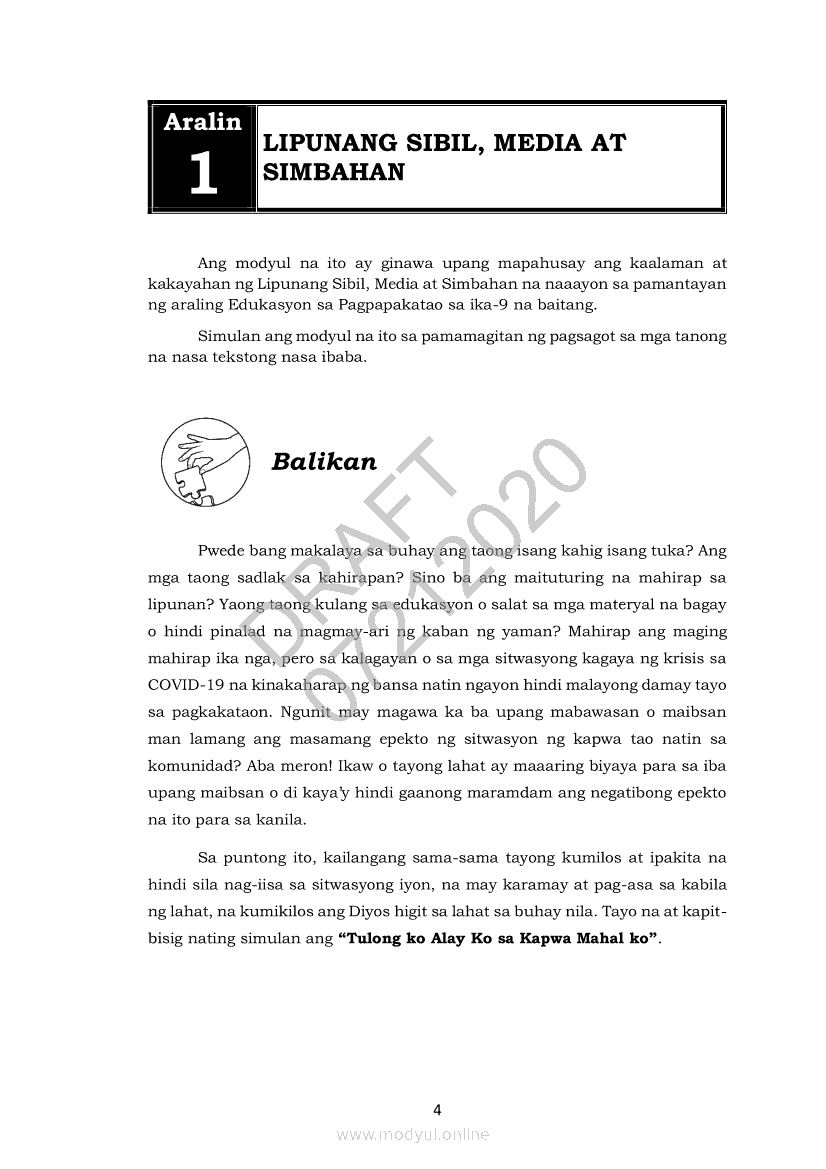 Edukasyon sa Pagpapakatao 9 Modyul 13 Lipunang Sibil, Alamin at PagyamaninApr 22, 2021 Grade 9Xiaomi Redmi Watch 5 Active 2inch LCD Display Clear Calling 5ATM Waterproof Smart Watch for only ₱3,999 ₱1,200!. Edukasyon sa Pagpapakatao 9RelatedEdukasyon sa Pagpapakatao Ikaapat na Markahan – Modyul 3: Personal na Pahayag ng Misyon sa Buhay (Ikatlong Linggo)Edukasyon sa Pagpapakatao Ikaapat na Markahan- Modyul 1: Mga Pansariling Salik sa Pagpili ng Track o Kursong Akademik, Teknikal-Bokasyonal, Sining at Disenyo, at Isports. (Unang Linggo)Edukasyon sa Pagpapakatao Ikaapat na Markahan- Modyul 2: Mga Pansariling Salik sa Pagpili ng Track o Kursong Akademik, Teknikal-Bokasyonal, Sining at Disenyo, at Isports. (Ikalawang Linggo)Edukasyon sa Pagpapakatao Ikaapat na Markahan – Modyul 4: Personal na Pahayag ng Misyon sa Buhay (Ikaapat na Linggo)Edukasyon sa Pagpapakatao 9 Ikalawang Markahan – Modyul 3: Ang Paggawa Bilang Paglilingkod at Pagtaguyod ng Dignidad ng Tao