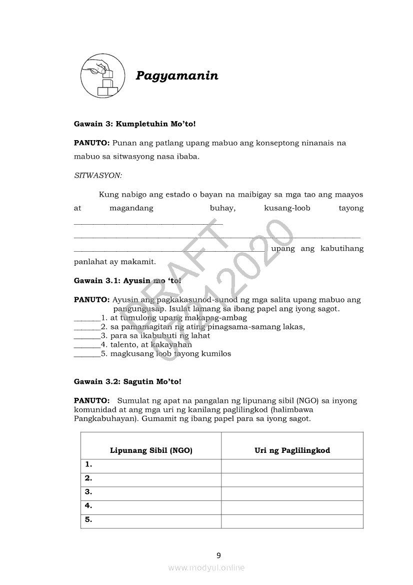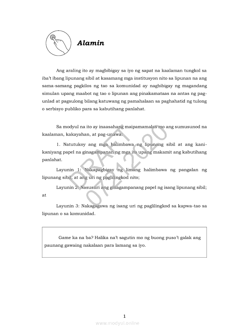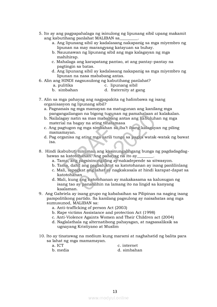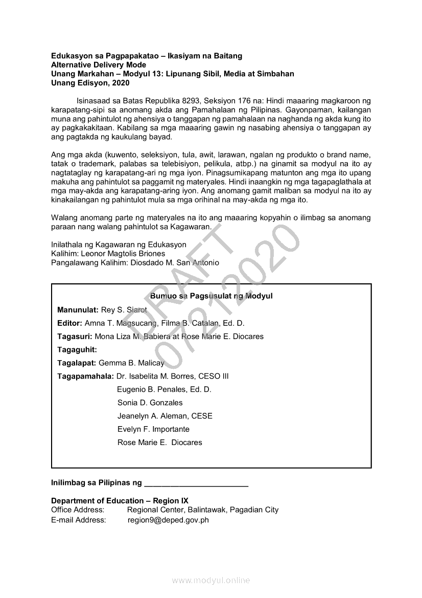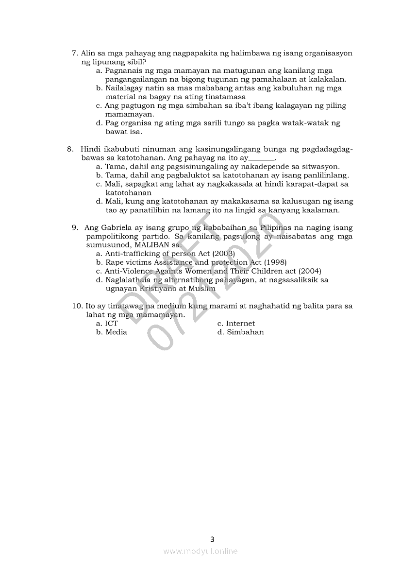 Edukasyon sa Pagpapakatao 9 Modyul 13 Lipunang Sibil, Alamin at PagyamaninApr 22, 2021 Grade 9Xiaomi Redmi Watch 5 Active 2inch LCD Display Clear Calling 5ATM Waterproof Smart Watch for only ₱3,999 ₱1,200!. Edukasyon sa Pagpapakatao 9RelatedEdukasyon sa Pagpapakatao Ikaapat na Markahan – Modyul 3: Personal na Pahayag ng Misyon sa Buhay (Ikatlong Linggo)Edukasyon sa Pagpapakatao Ikaapat na Markahan- Modyul 1: Mga Pansariling Salik sa Pagpili ng Track o Kursong Akademik, Teknikal-Bokasyonal, Sining at Disenyo, at Isports. (Unang Linggo)Edukasyon sa Pagpapakatao Ikaapat na Markahan- Modyul 2: Mga Pansariling Salik sa Pagpili ng Track o Kursong Akademik, Teknikal-Bokasyonal, Sining at Disenyo, at Isports. (Ikalawang Linggo)Edukasyon sa Pagpapakatao Ikaapat na Markahan – Modyul 4: Personal na Pahayag ng Misyon sa Buhay (Ikaapat na Linggo)Edukasyon sa Pagpapakatao 9 Ikalawang Markahan – Modyul 3: Ang Paggawa Bilang Paglilingkod at Pagtaguyod ng Dignidad ng Tao