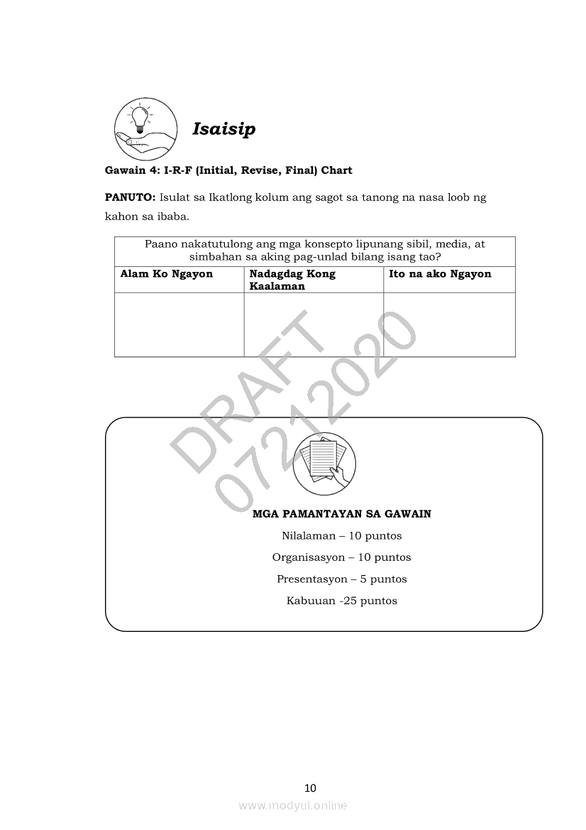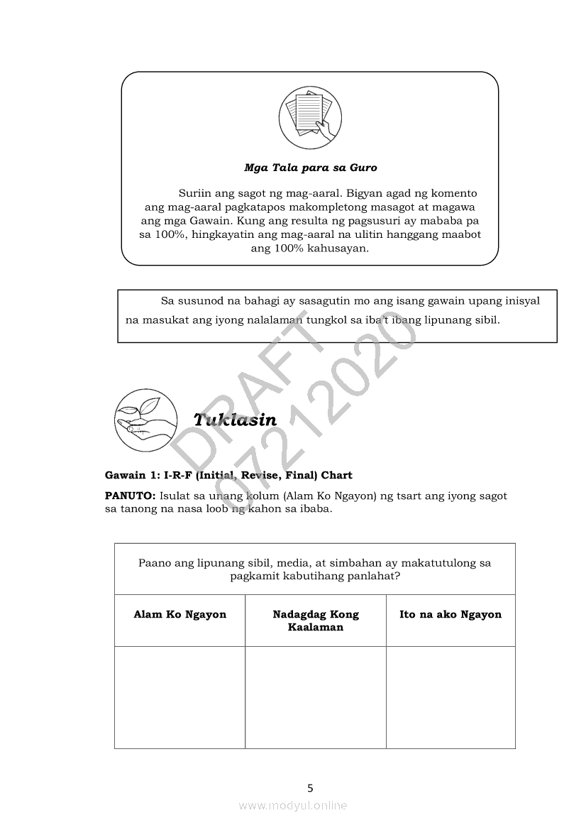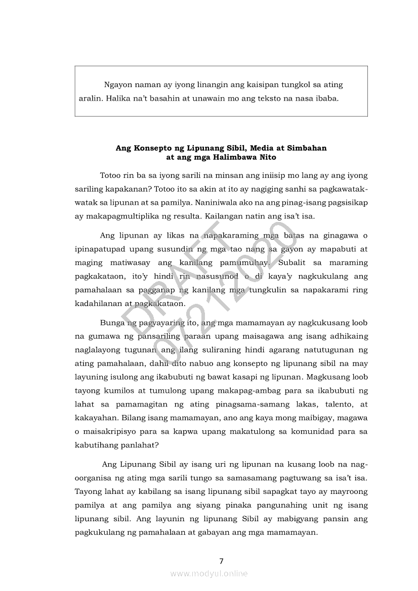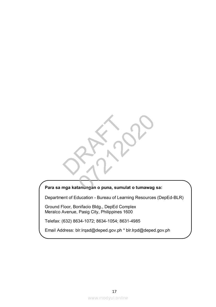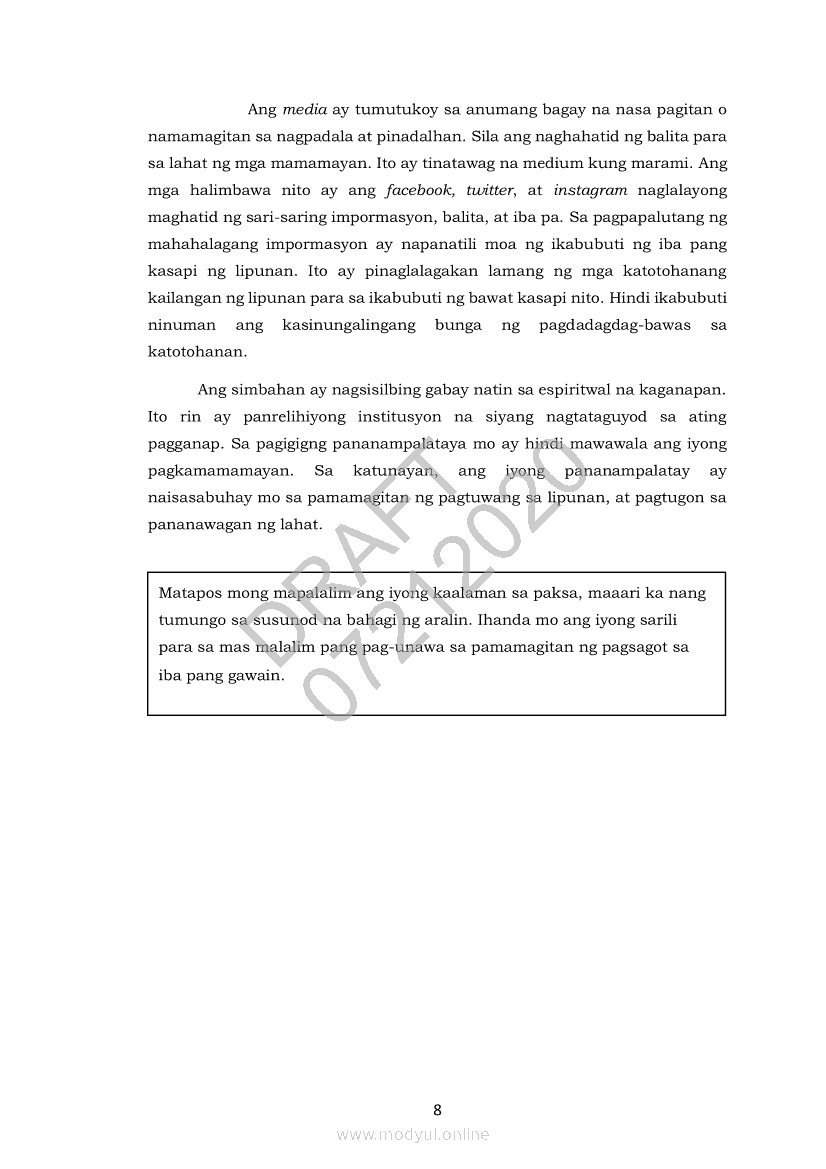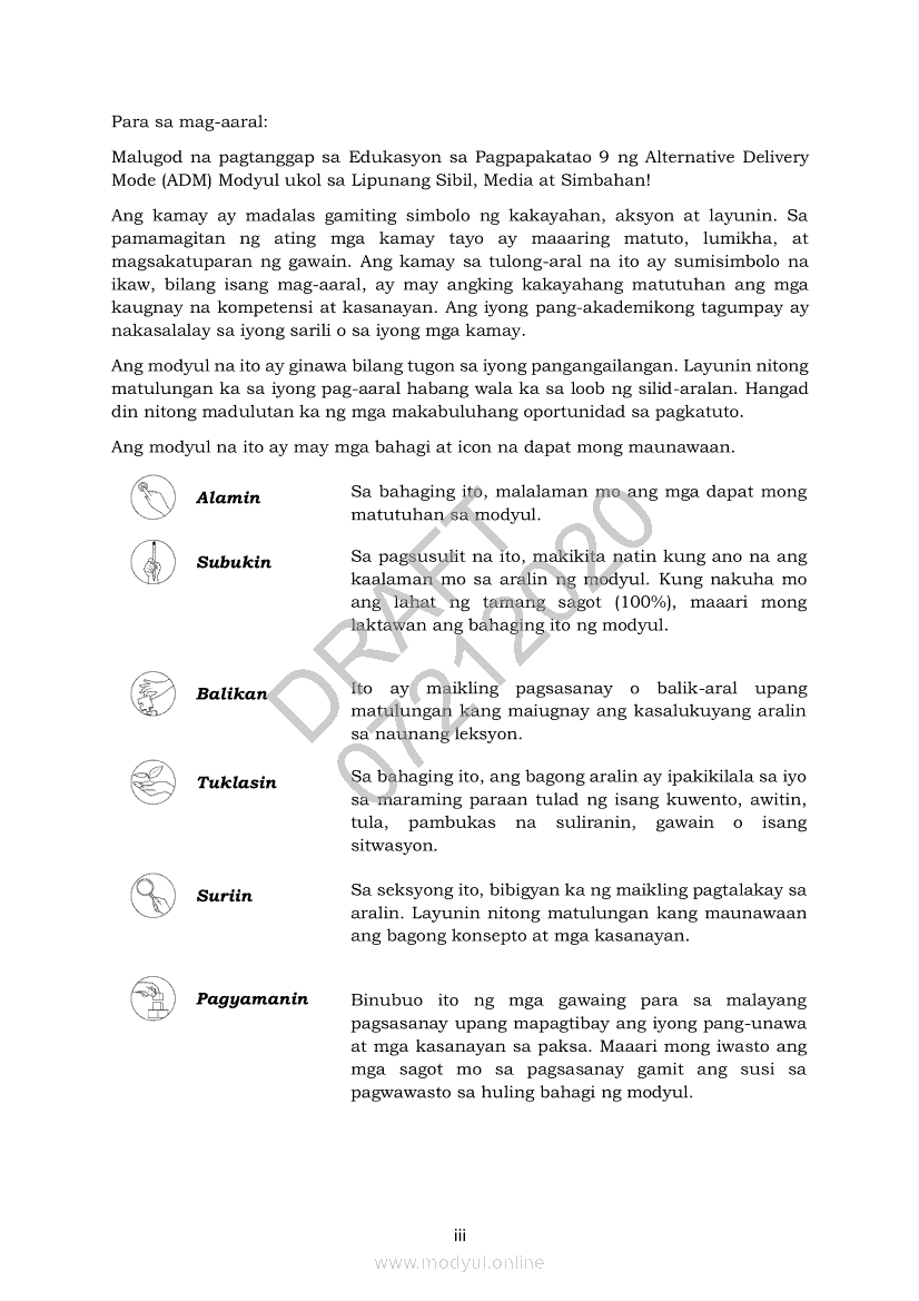 Edukasyon sa Pagpapakatao 9 Modyul 13 Lipunang Sibil, Alamin at PagyamaninApr 22, 2021 Grade 9Xiaomi Redmi Watch 5 Active 2inch LCD Display Clear Calling 5ATM Waterproof Smart Watch for only ₱3,999 ₱1,200!. Edukasyon sa Pagpapakatao 9RelatedEdukasyon sa Pagpapakatao Ikaapat na Markahan – Modyul 3: Personal na Pahayag ng Misyon sa Buhay (Ikatlong Linggo)Edukasyon sa Pagpapakatao Ikaapat na Markahan- Modyul 1: Mga Pansariling Salik sa Pagpili ng Track o Kursong Akademik, Teknikal-Bokasyonal, Sining at Disenyo, at Isports. (Unang Linggo)Edukasyon sa Pagpapakatao Ikaapat na Markahan- Modyul 2: Mga Pansariling Salik sa Pagpili ng Track o Kursong Akademik, Teknikal-Bokasyonal, Sining at Disenyo, at Isports. (Ikalawang Linggo)Edukasyon sa Pagpapakatao Ikaapat na Markahan – Modyul 4: Personal na Pahayag ng Misyon sa Buhay (Ikaapat na Linggo)Edukasyon sa Pagpapakatao 9 Ikalawang Markahan – Modyul 3: Ang Paggawa Bilang Paglilingkod at Pagtaguyod ng Dignidad ng Tao