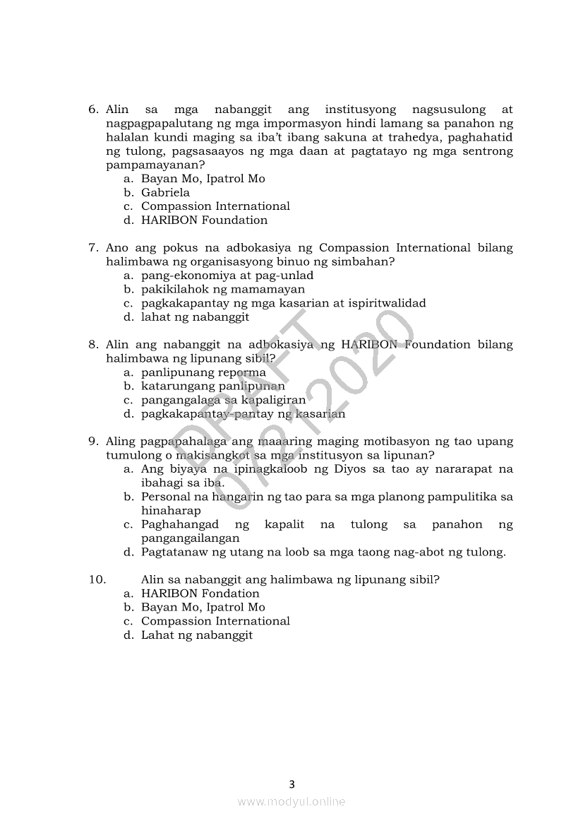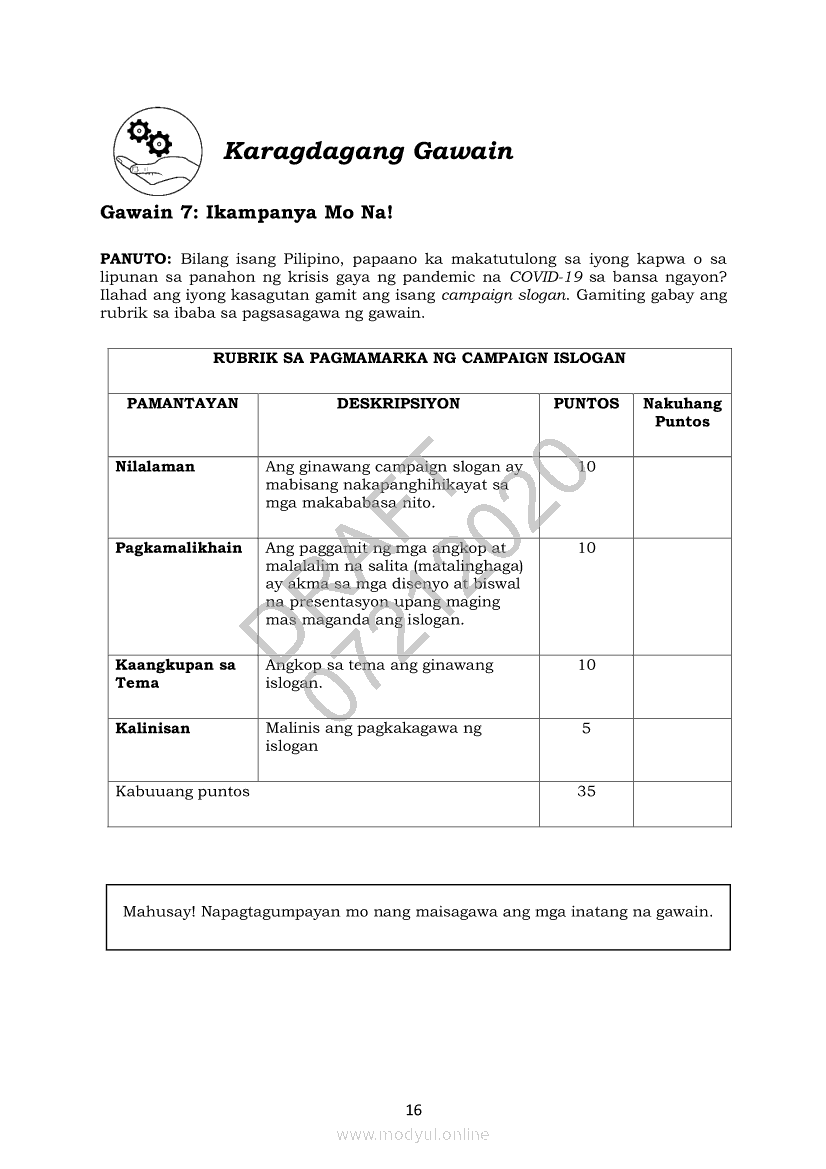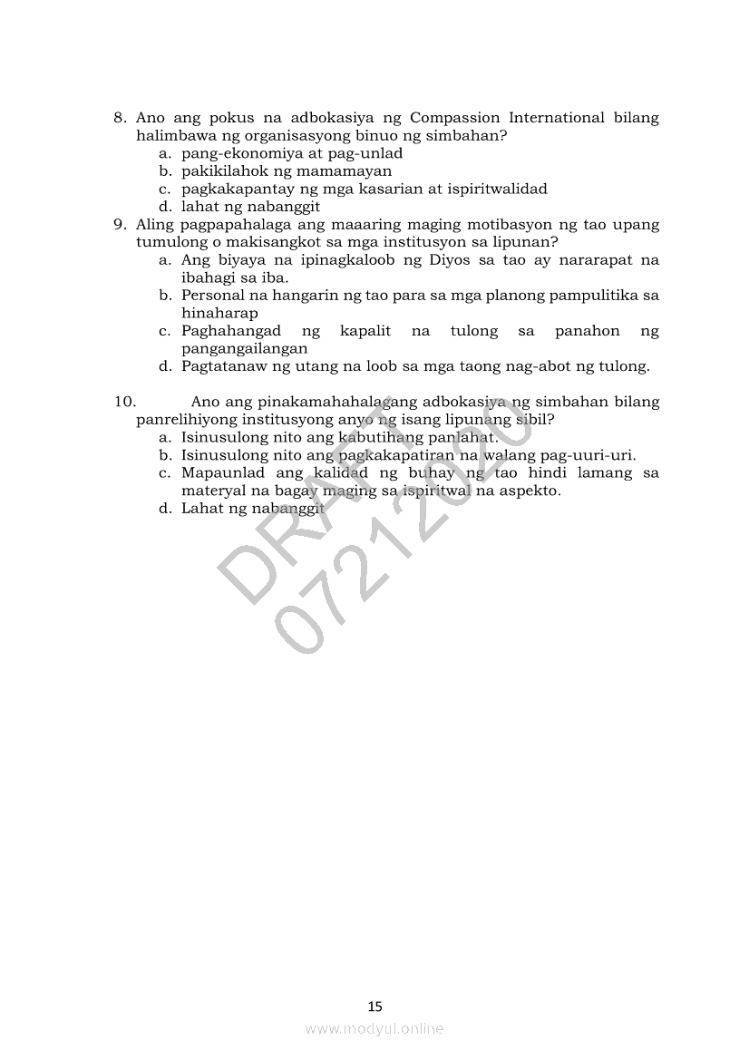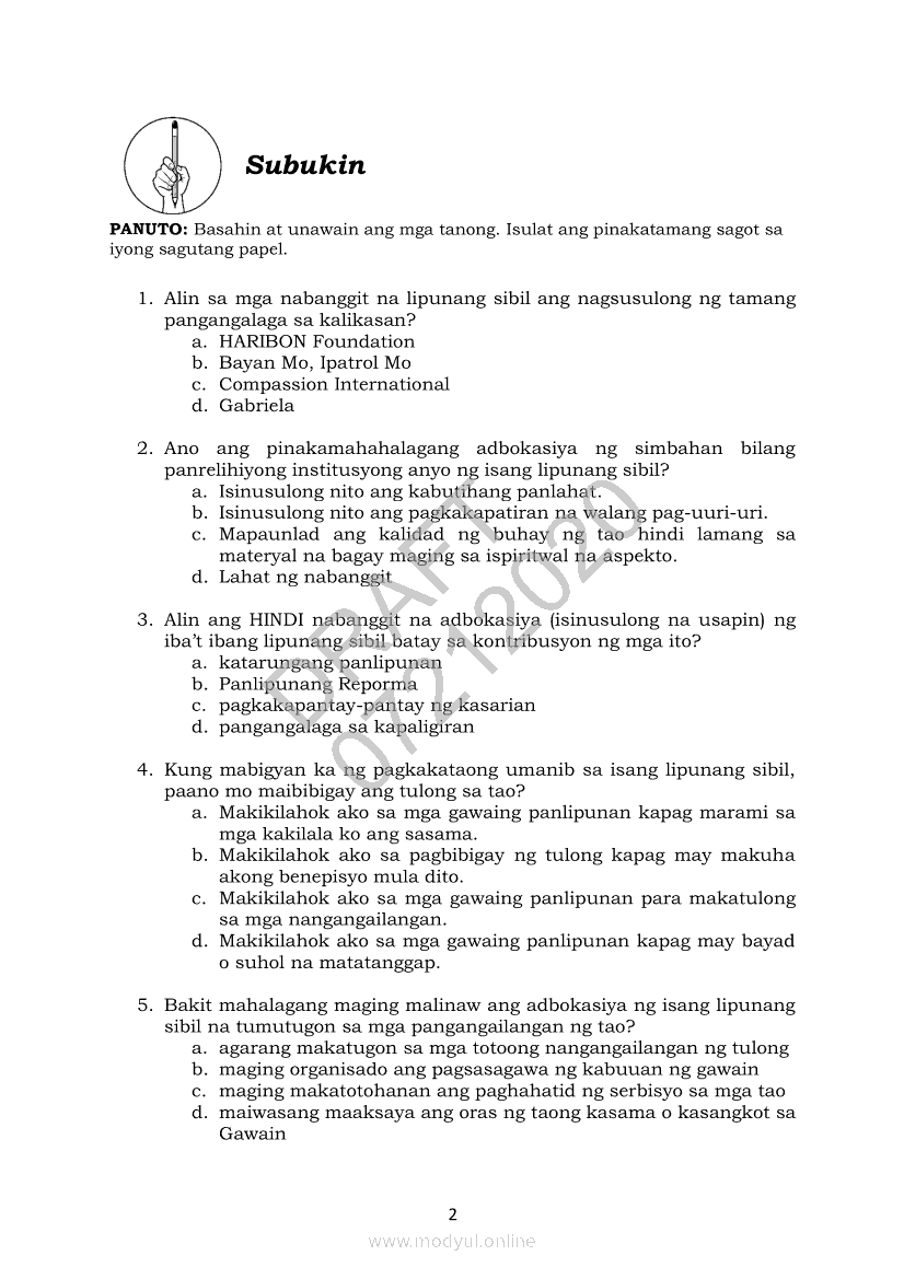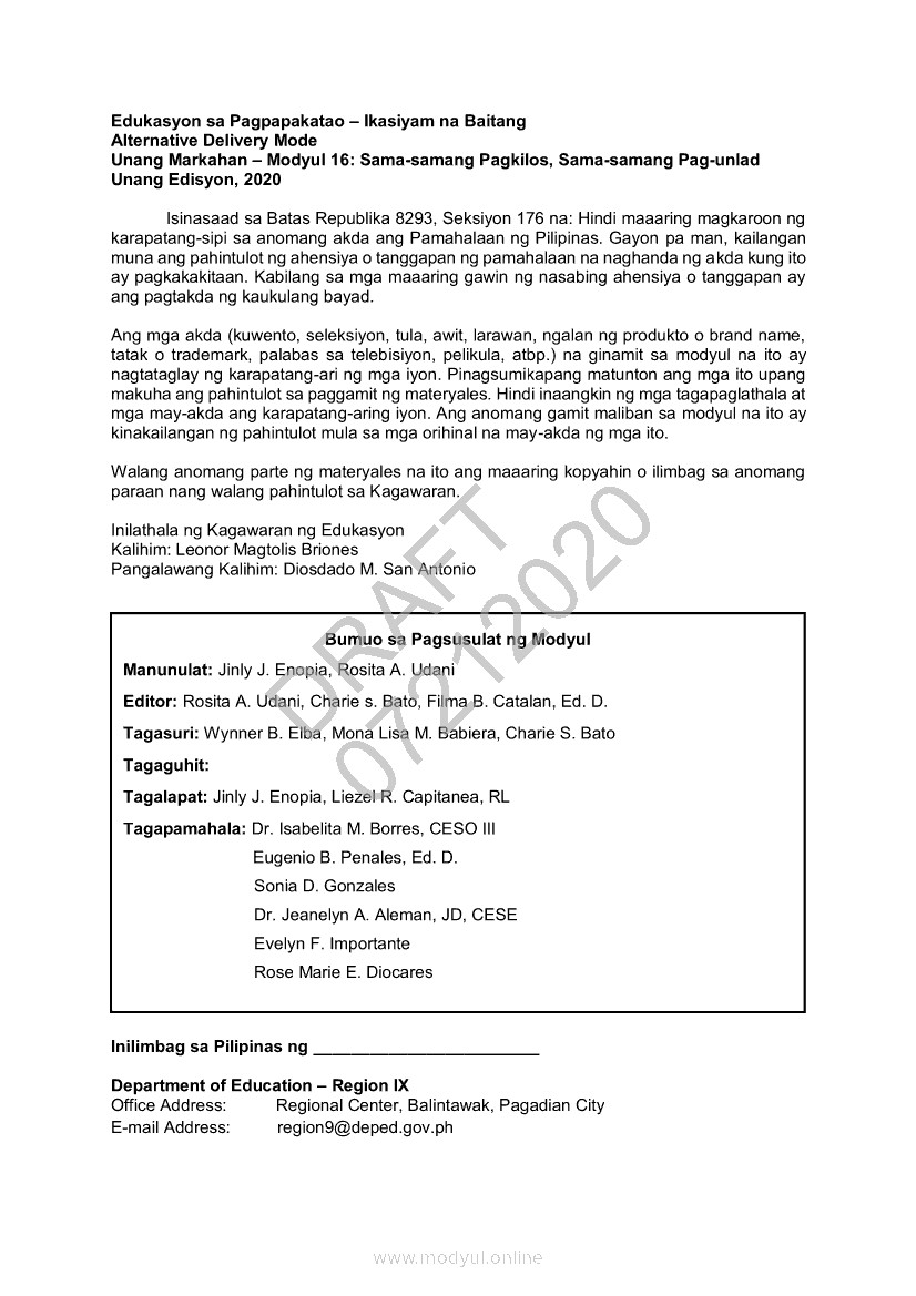 Edukasyon sa Pagpapakatao 9 Modyul 16: Sama-samang Pagkilos, Sama-samang Pag-unladApr 22, 2021 Grade 9Xiaomi Redmi Watch 5 Active 2inch LCD Display Clear Calling 5ATM Waterproof Smart Watch for only ₱3,999 ₱1,200!. Edukasyon sa Pagpapakatao 9RelatedEdukasyon sa Pagpapakatao Ikaapat na Markahan- Modyul 2: Mga Pansariling Salik sa Pagpili ng Track o Kursong Akademik, Teknikal-Bokasyonal, Sining at Disenyo, at Isports. (Ikalawang Linggo)Edukasyon sa Pagpapakatao Ikaapat na Markahan- Modyul 1: Mga Pansariling Salik sa Pagpili ng Track o Kursong Akademik, Teknikal-Bokasyonal, Sining at Disenyo, at Isports. (Unang Linggo)Edukasyon sa Pagpapakatao Ikaapat na Markahan – Modyul 3: Personal na Pahayag ng Misyon sa Buhay (Ikatlong Linggo)Edukasyon sa Pagpapakatao Ikaapat na Markahan – Modyul 4: Personal na Pahayag ng Misyon sa Buhay (Ikaapat na Linggo)Edukasyon sa Pagpapakatao 9 Ikalawang Markahan – Modyul 3: Ang Paggawa Bilang Paglilingkod at Pagtaguyod ng Dignidad ng Tao