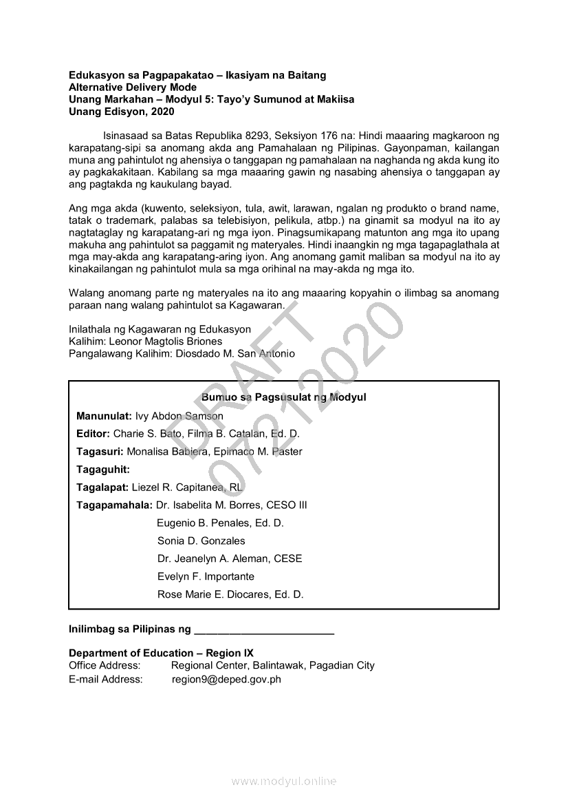 Edukasyon sa Pagpapakatao 9 Modyul 5: Tayo’y Sumunod at MakiisaApr 22, 2021 Grade 9Xiaomi Redmi Watch 5 Active 2inch LCD Display Clear Calling 5ATM Waterproof Smart Watch for only ₱3,999 ₱1,200!. Edukasyon sa Pagpapakatao 9RelatedEdukasyon sa Pagpapakatao Ikaapat na Markahan – Modyul 3: Personal na Pahayag ng Misyon sa Buhay (Ikatlong Linggo)Edukasyon sa Pagpapakatao Ikaapat na Markahan- Modyul 2: Mga Pansariling Salik sa Pagpili ng Track o Kursong Akademik, Teknikal-Bokasyonal, Sining at Disenyo, at Isports. (Ikalawang Linggo)Edukasyon sa Pagpapakatao Ikaapat na Markahan – Modyul 4: Personal na Pahayag ng Misyon sa Buhay (Ikaapat na Linggo)Edukasyon sa Pagpapakatao Ikaapat na Markahan- Modyul 1: Mga Pansariling Salik sa Pagpili ng Track o Kursong Akademik, Teknikal-Bokasyonal, Sining at Disenyo, at Isports. (Unang Linggo)Edukasyon sa Pagpapakatao 9 Modyul 10 Bukod Tanging Yaman