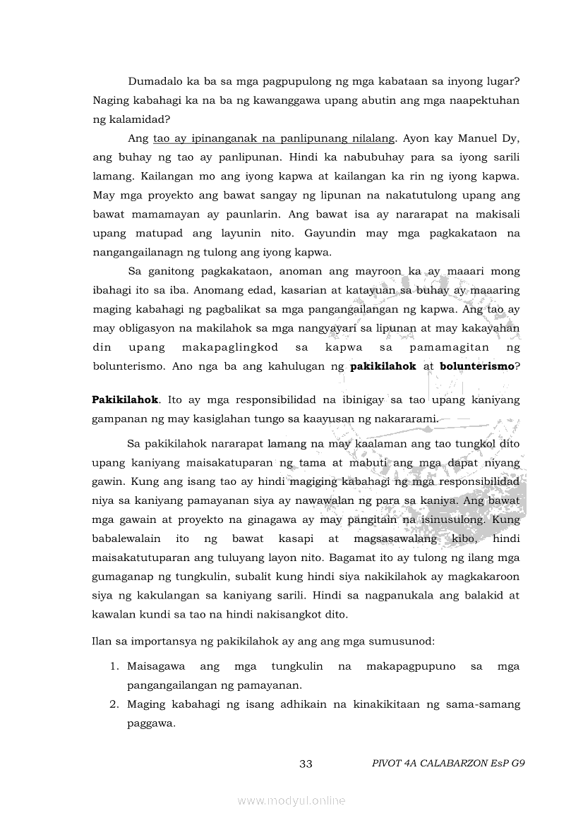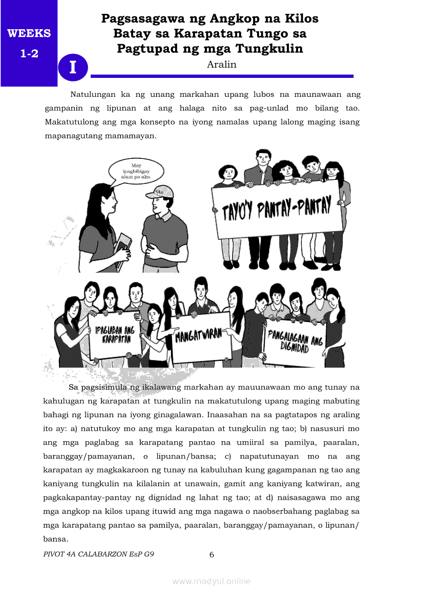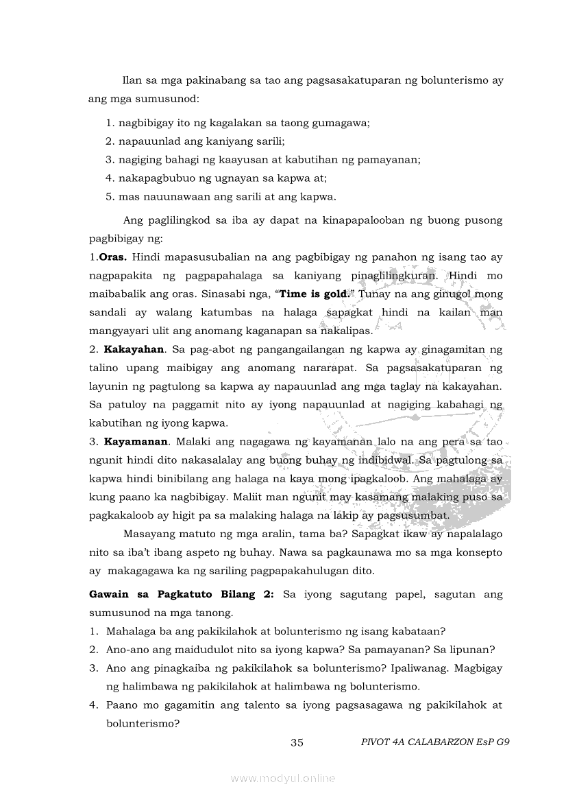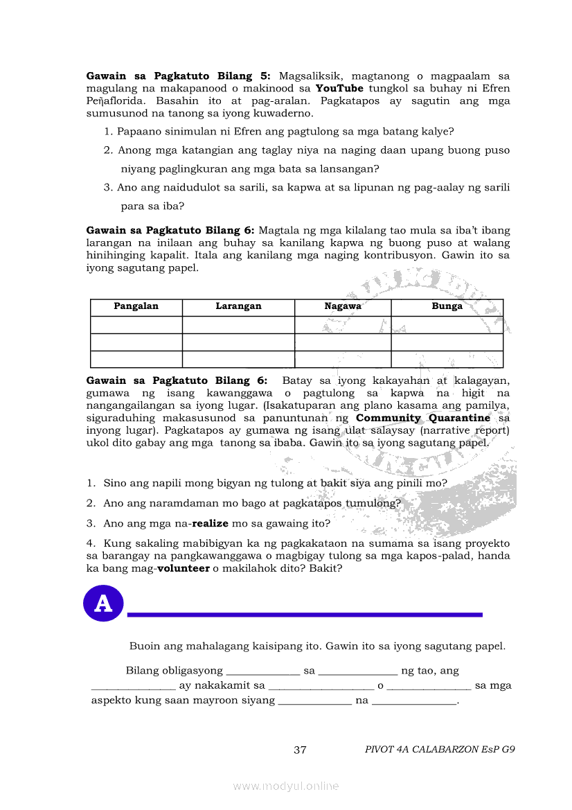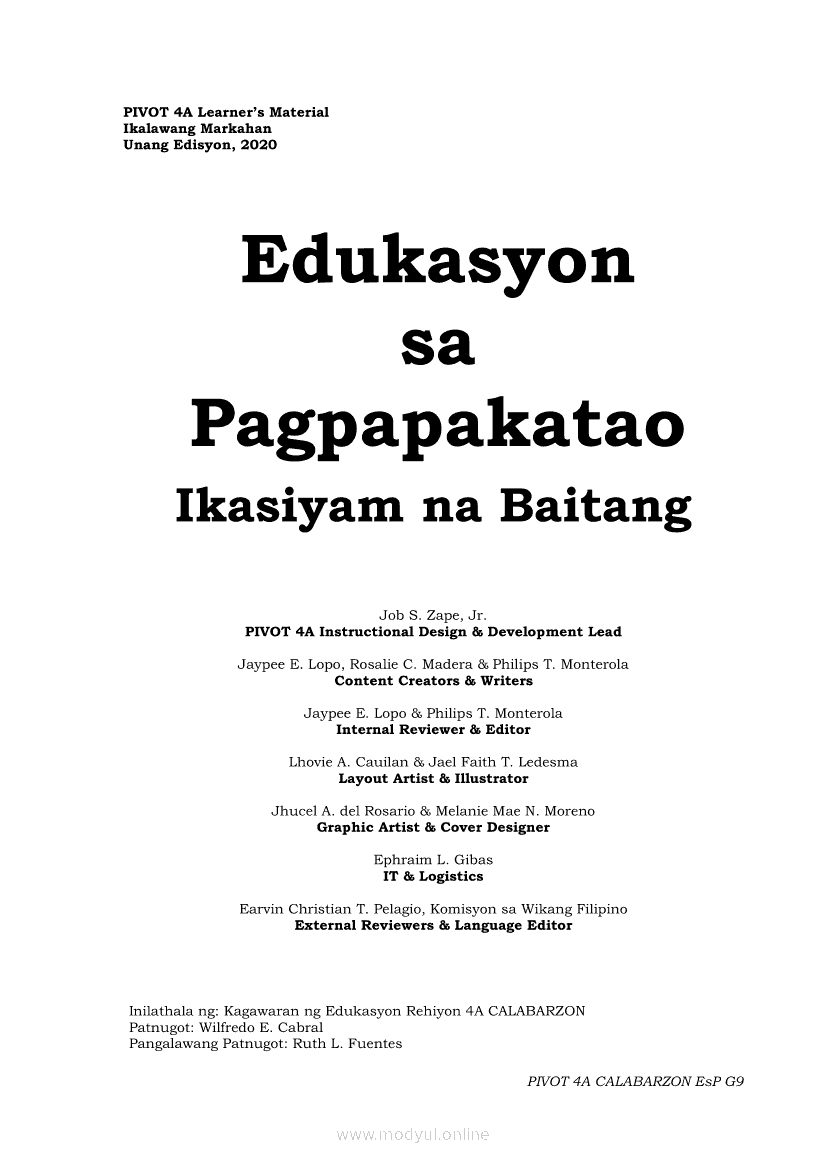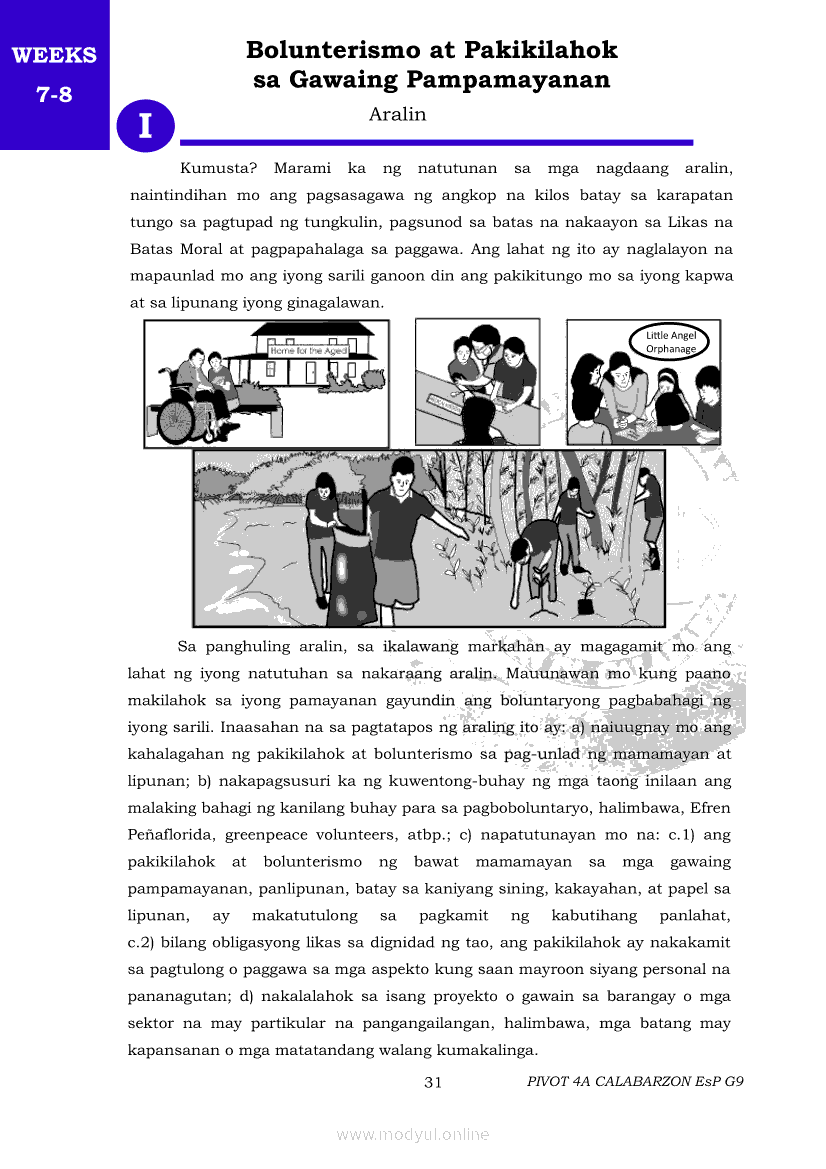 Edukasyon sa Pagpapakatao 9 Modyul para sa Ikalawang Markahan (PIVOT)Apr 22, 2021 Grade 9Xiaomi Redmi Watch 5 Active 2inch LCD Display Clear Calling 5ATM Waterproof Smart Watch for only ₱3,999 ₱1,200!. Edukasyon sa Pagpapakatao 9RelatedEdukasyon sa Pagpapakatao Ikaapat na Markahan- Modyul 2: Mga Pansariling Salik sa Pagpili ng Track o Kursong Akademik, Teknikal-Bokasyonal, Sining at Disenyo, at Isports. (Ikalawang Linggo)Edukasyon sa Pagpapakatao Ikaapat na Markahan- Modyul 1: Mga Pansariling Salik sa Pagpili ng Track o Kursong Akademik, Teknikal-Bokasyonal, Sining at Disenyo, at Isports. (Unang Linggo)Edukasyon sa Pagpapakatao Ikaapat na Markahan – Modyul 3: Personal na Pahayag ng Misyon sa Buhay (Ikatlong Linggo)Edukasyon sa Pagpapakatao Ikaapat na Markahan – Modyul 4: Personal na Pahayag ng Misyon sa Buhay (Ikaapat na Linggo)Edukasyon sa Pagpapakatao 9 Ikalawang Markahan – Modyul 4: Pakikilahok at Bolunterismo