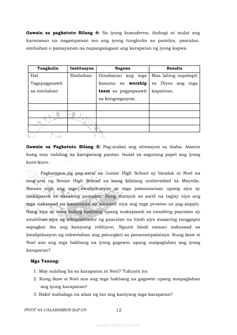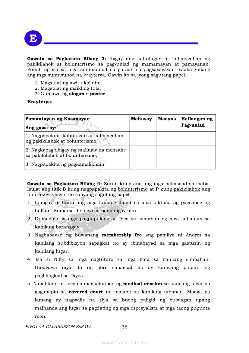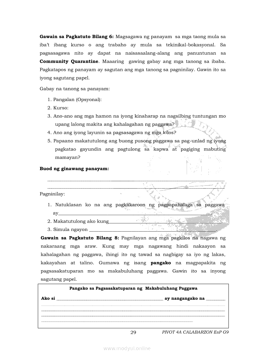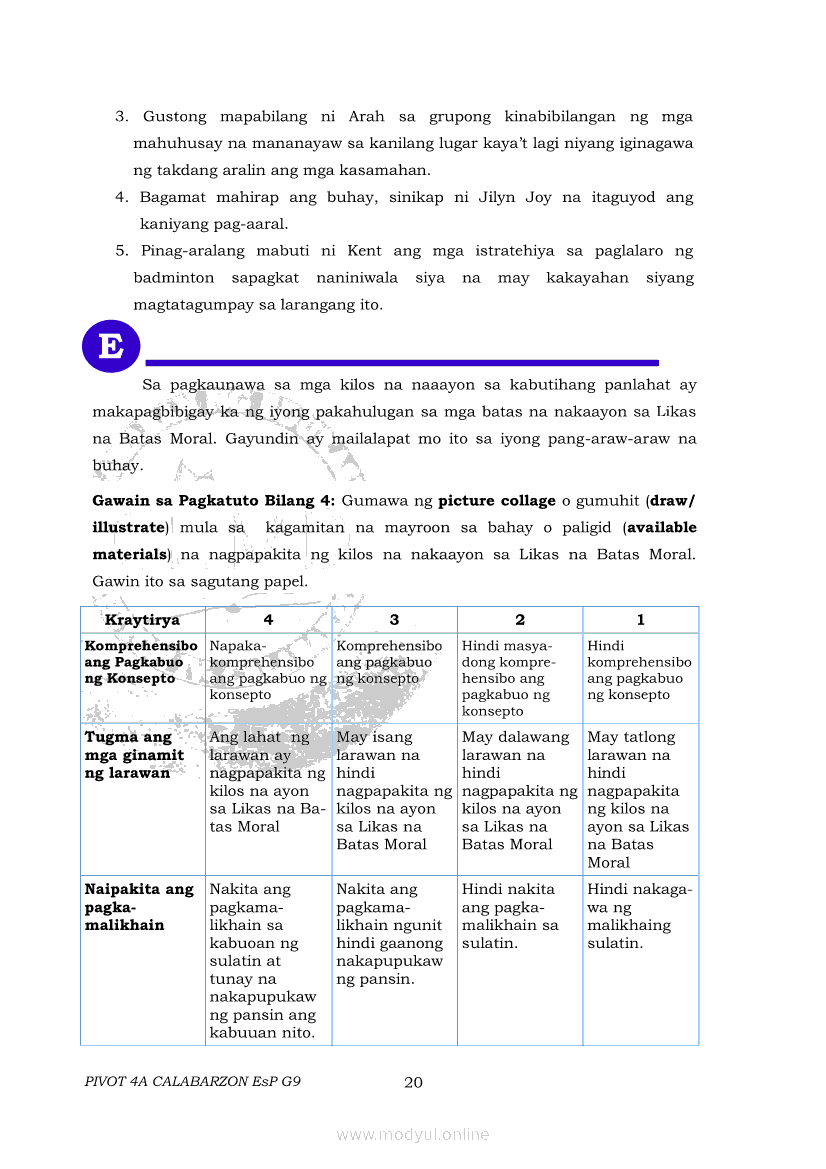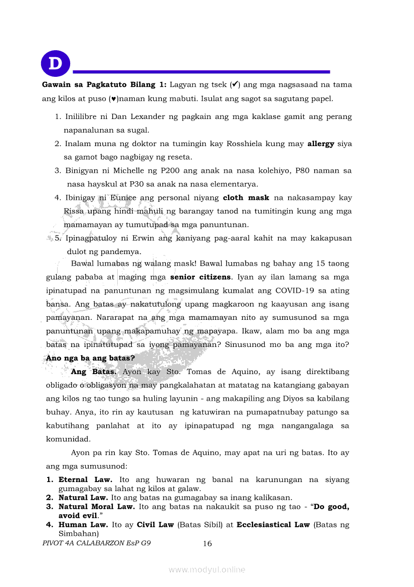 Edukasyon sa Pagpapakatao 9 Modyul para sa Ikalawang Markahan (PIVOT)Apr 22, 2021 Grade 9Xiaomi Redmi Watch 5 Active 2inch LCD Display Clear Calling 5ATM Waterproof Smart Watch for only ₱3,999 ₱1,200!. Edukasyon sa Pagpapakatao 9RelatedEdukasyon sa Pagpapakatao Ikaapat na Markahan- Modyul 2: Mga Pansariling Salik sa Pagpili ng Track o Kursong Akademik, Teknikal-Bokasyonal, Sining at Disenyo, at Isports. (Ikalawang Linggo)Edukasyon sa Pagpapakatao Ikaapat na Markahan- Modyul 1: Mga Pansariling Salik sa Pagpili ng Track o Kursong Akademik, Teknikal-Bokasyonal, Sining at Disenyo, at Isports. (Unang Linggo)Edukasyon sa Pagpapakatao Ikaapat na Markahan – Modyul 3: Personal na Pahayag ng Misyon sa Buhay (Ikatlong Linggo)Edukasyon sa Pagpapakatao Ikaapat na Markahan – Modyul 4: Personal na Pahayag ng Misyon sa Buhay (Ikaapat na Linggo)Edukasyon sa Pagpapakatao 9 Ikalawang Markahan – Modyul 4: Pakikilahok at Bolunterismo