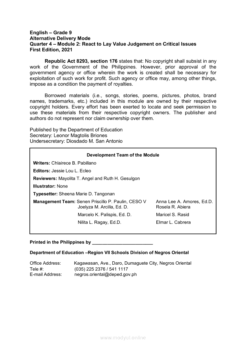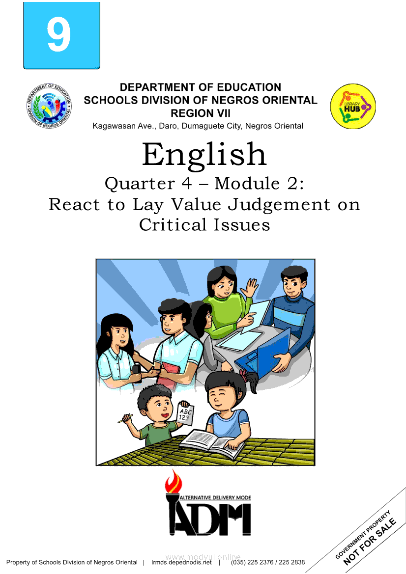 English Quarter 4 – Module 2: React to Lay Value Judgement on Critical IssuesMay 28, 2021 Grade 9Xiaomi Redmi Watch 5 Active 2inch LCD Display Clear Calling 5ATM Waterproof Smart Watch for only ₱3,999 ₱1,200!. English 9 4th QuarterRelatedEnglish Quarter 4 – Module 1: Judge the Relevance and Worth of Ideas, Soundness of Author’s Reasoning, and the Effectiveness of the PresentationTLE – HE – FRONT OFFICE SERVICES Quarter 4 – Module 1: PROVIDE PORTER SERVICES Hotel Procedures for Handling LuggageAraling Panlipunan Ikaapat na Markahan – Modyul 6: Mga Patakaran at Programa sa Sektor ng Industriya at PaglilingkodFilipino 9 Ikaapat na Markahan – Modyul 1 KALIGIRANG PANGKASAYSAYAN NG NOLI ME TANGEREFilipino 9 Ikaapat na Markahan – Modyul 3 Paglikom ng Datos sa Pananaliksik
