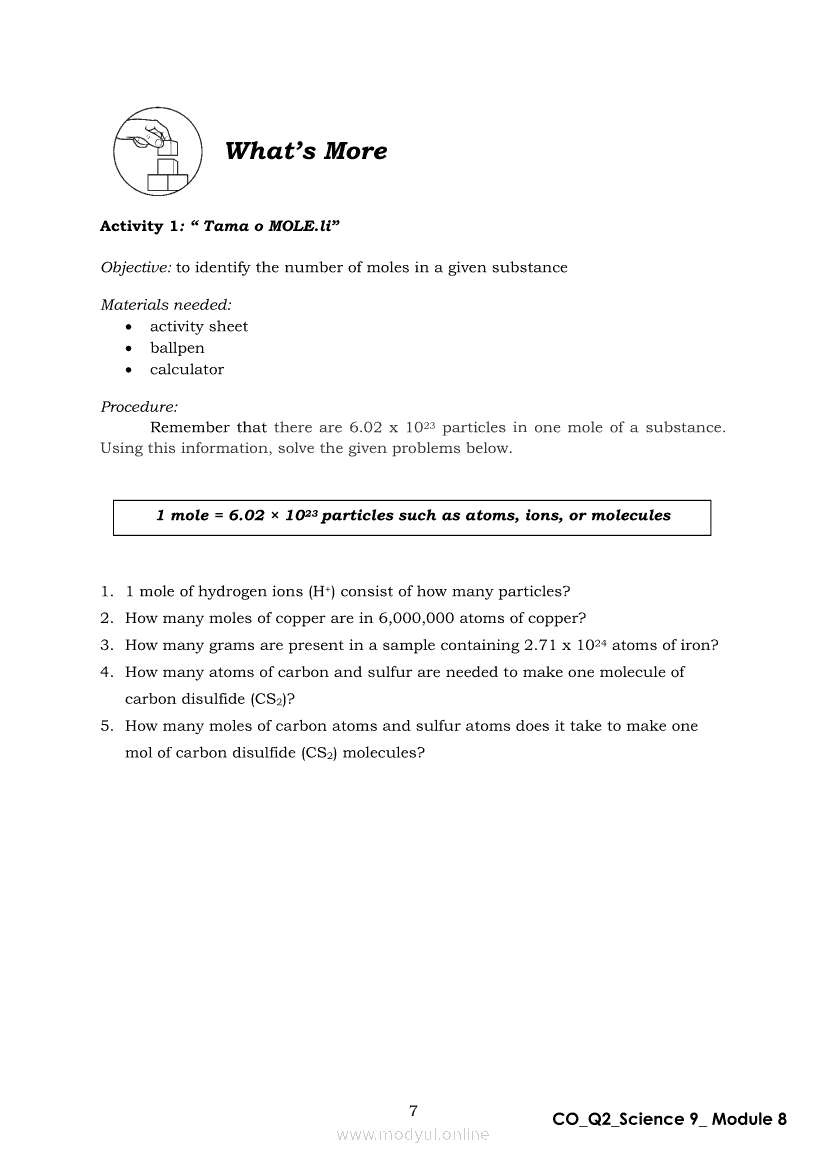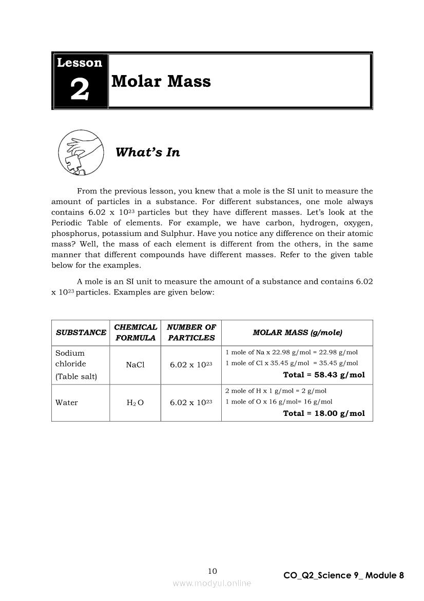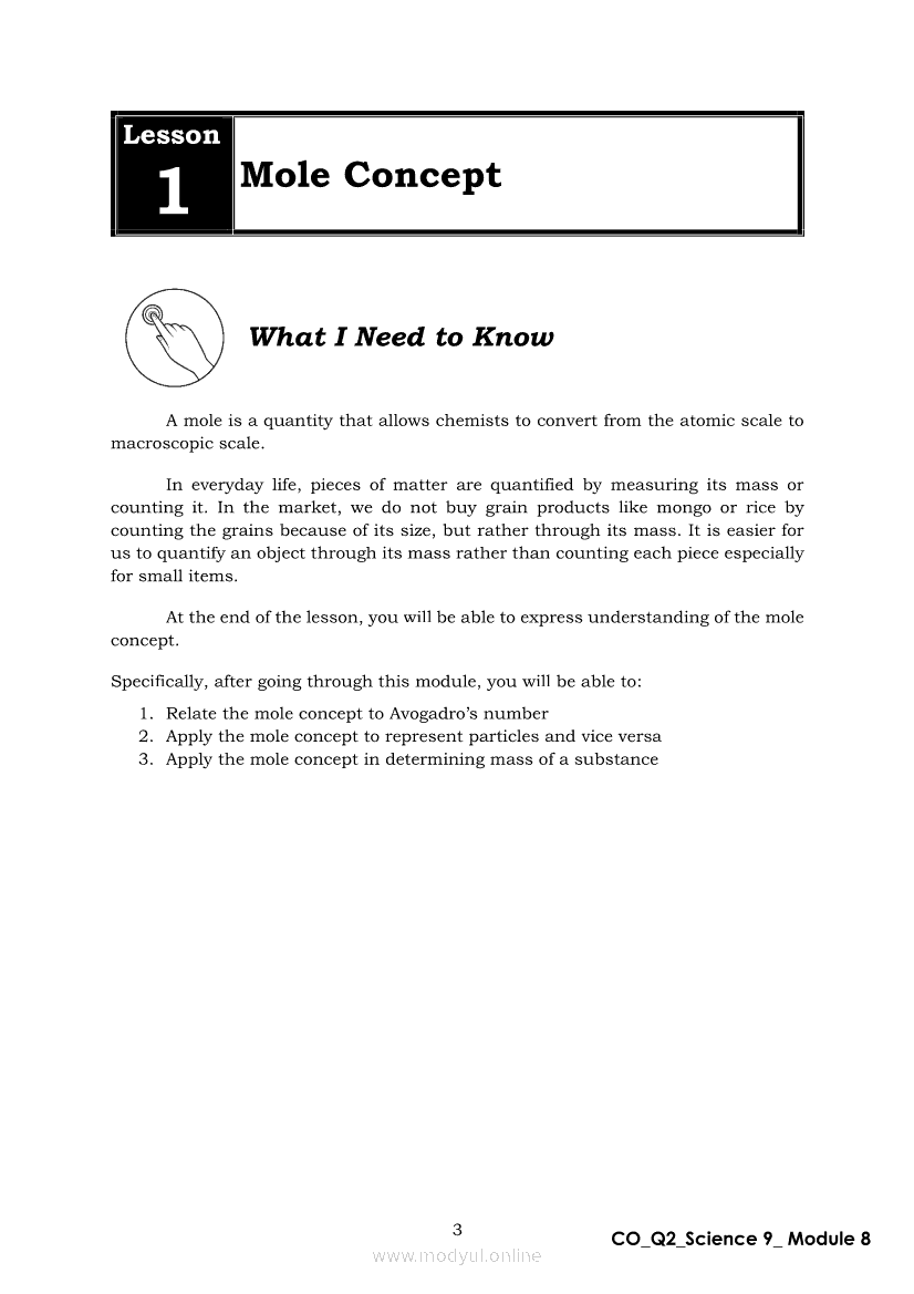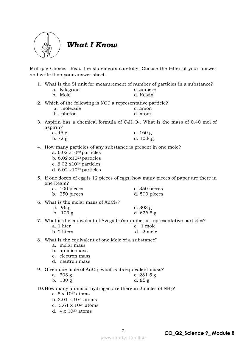Science 9 Quarter 2 – Module 8: Mole ConceptApr 22, 2021 Grade 9Xiaomi Redmi Watch 5 Active 2inch LCD Display Clear Calling 5ATM Waterproof Smart Watch for only ₱3,999 ₱1,200!. Science 9RelatedHEAT ENGINES for SCIENCE Grade 9 Quarter 4 / Week 6DESCRIBING PROJECTILE MOTION for SCIENCE Grade 9 Quarter 4 / Week 1HEAT AND WORK for SCIENCE Grade 9 Quarter 4 / Week 5Science 9 PIVOT-Module in ScienceScience 9 Quarter 2 – Module 1: Quantum Mechanical Model of an Atom