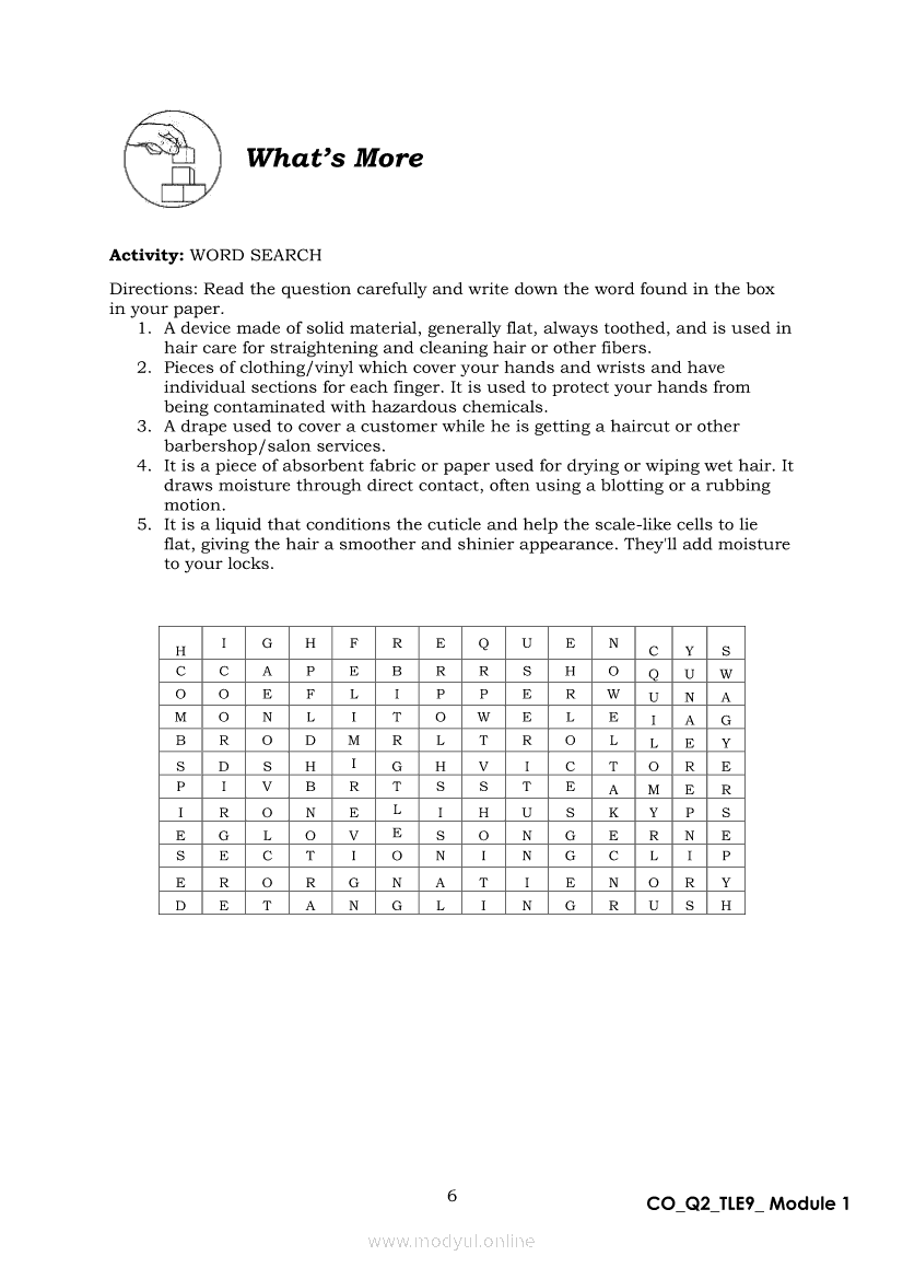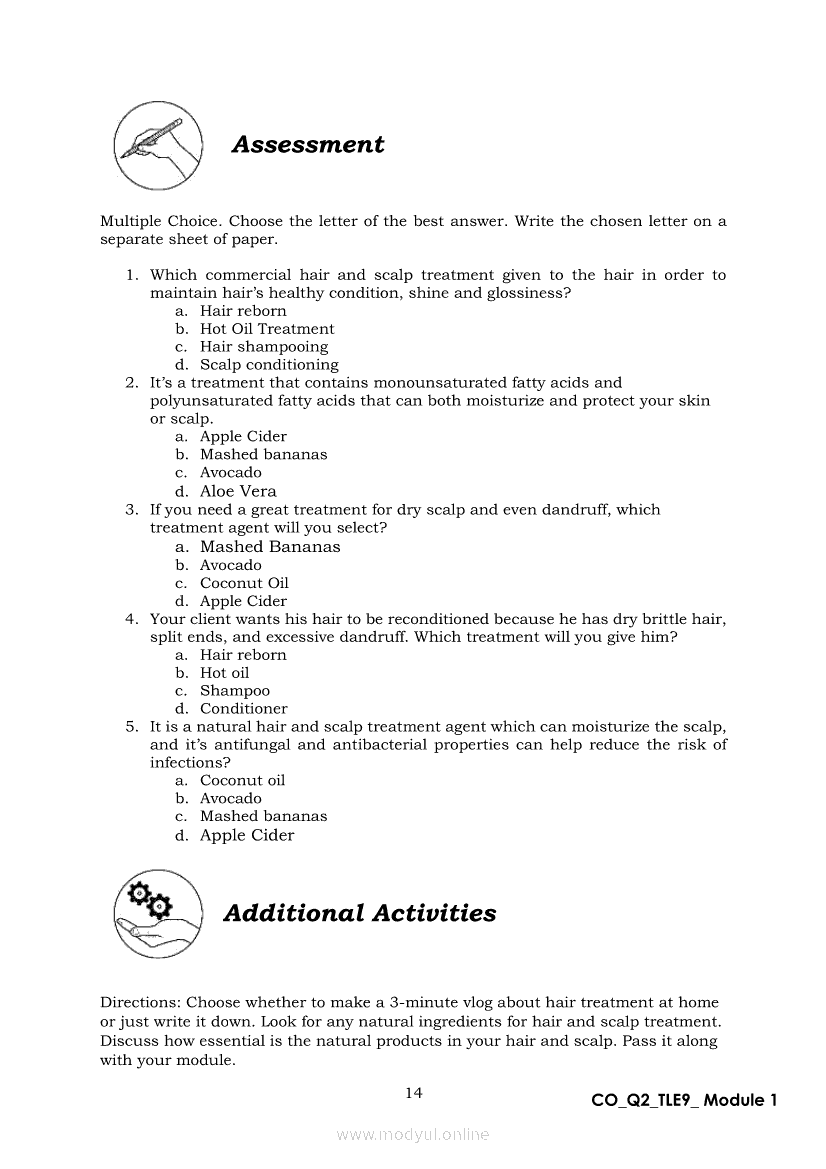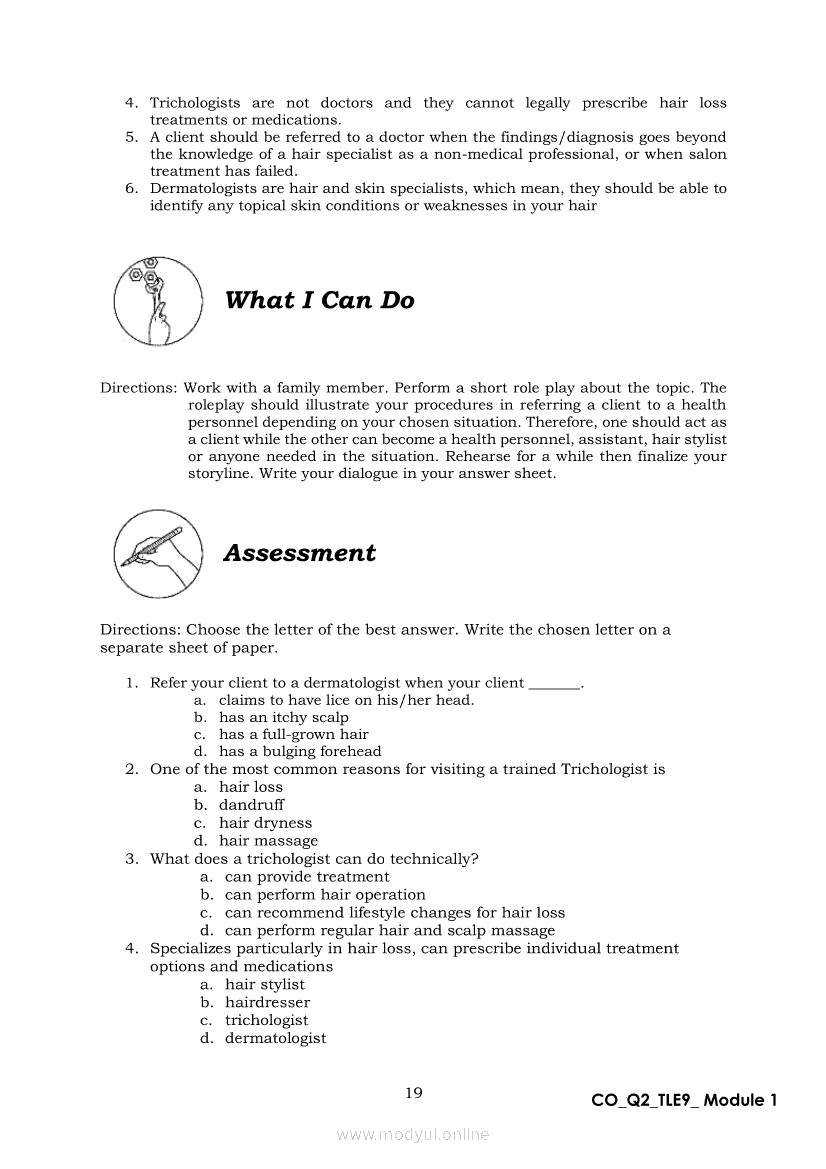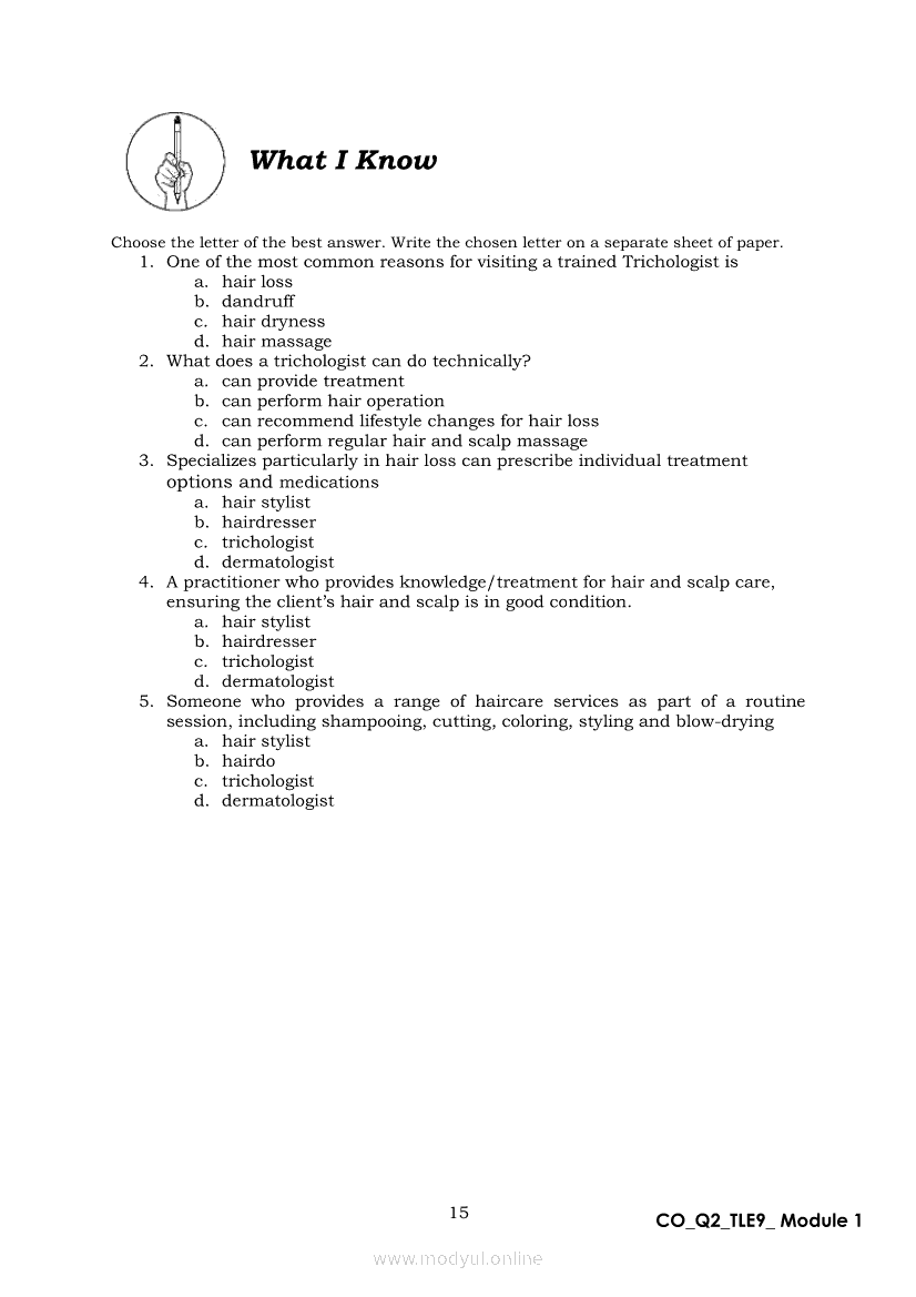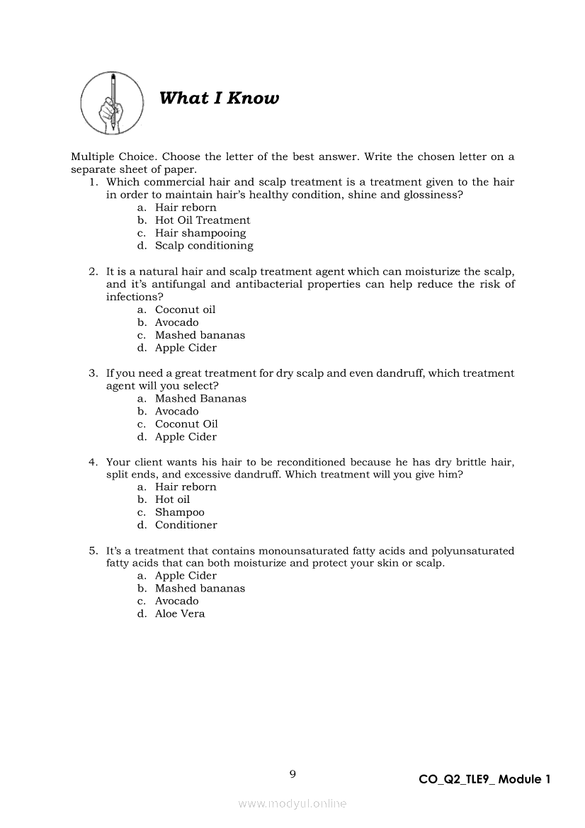 TLE 9 Quarter 2 – Module 1 Treat Hair and Scalp ConditionApr 22, 2021 Grade 9Xiaomi Redmi Watch 5 Active 2inch LCD Display Clear Calling 5ATM Waterproof Smart Watch for only ₱3,999 ₱1,200!. TLE 9RelatedTLE – ICT – CSS Quarter 4 – Module 1-4: Testing Electronic ComponentsTLE-IA-CARPENTRY Quarter 4 – Module 2 (Week 3&4) ASSEMBLING FORM PANELS AND STIFFENERSTLE-IA-CARPENTRY Quarter 4 – Module 3 (Week 5&6) STEPS IN SETTING AND FIXING FORM PANELS AND COMPONENTS ASSEMBLYTLE – H.E.- COOKERY Quarter 4 – Module 1: PREPARE SALAD DRESSING “Perform Mise en Place”TLE-IA-CARPENTRY Quarter 4 – Module 4: HAZARDS AND RISKS
