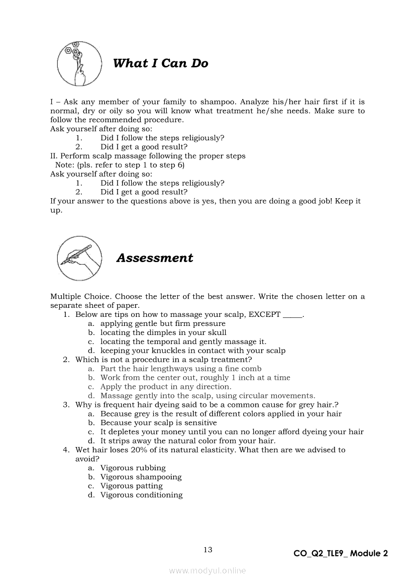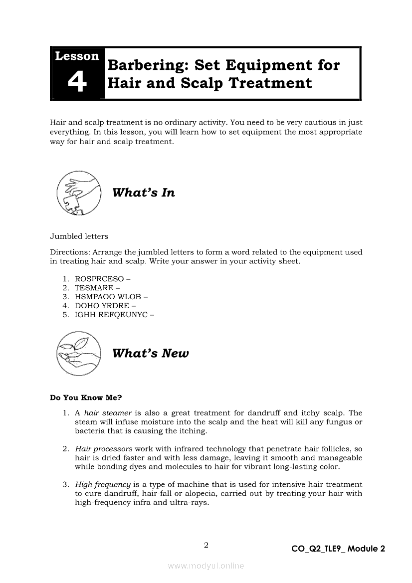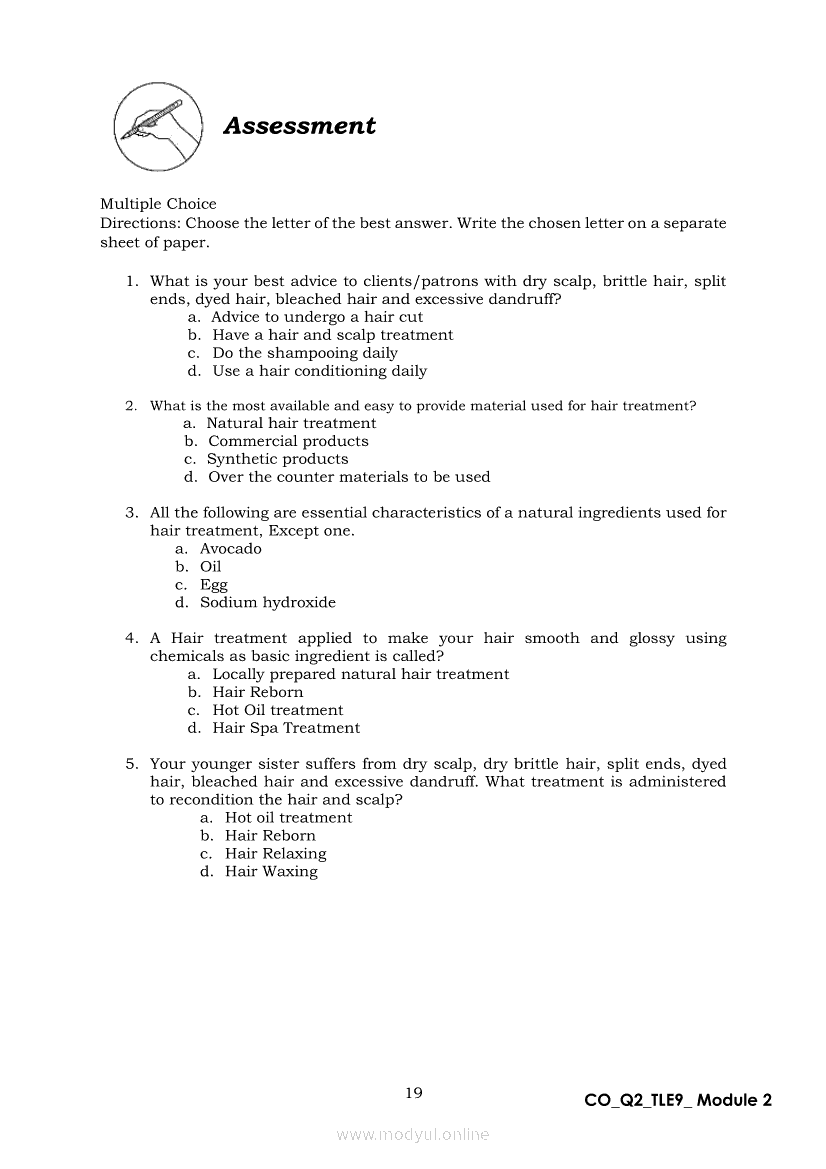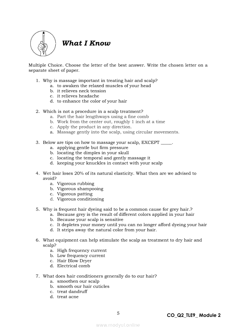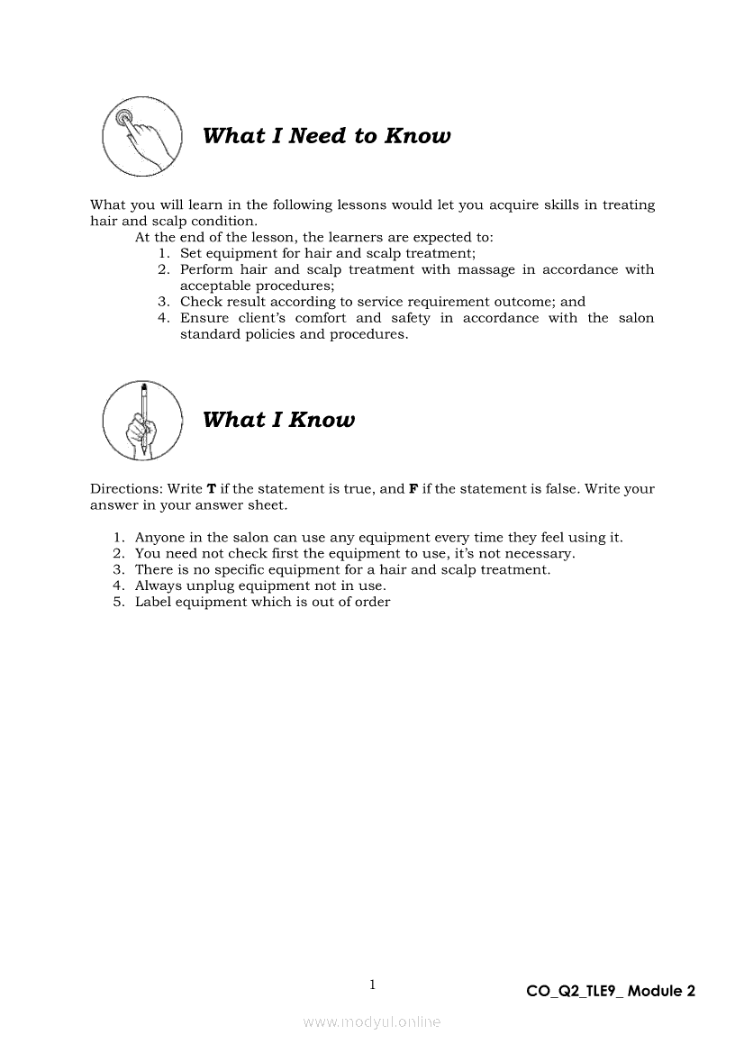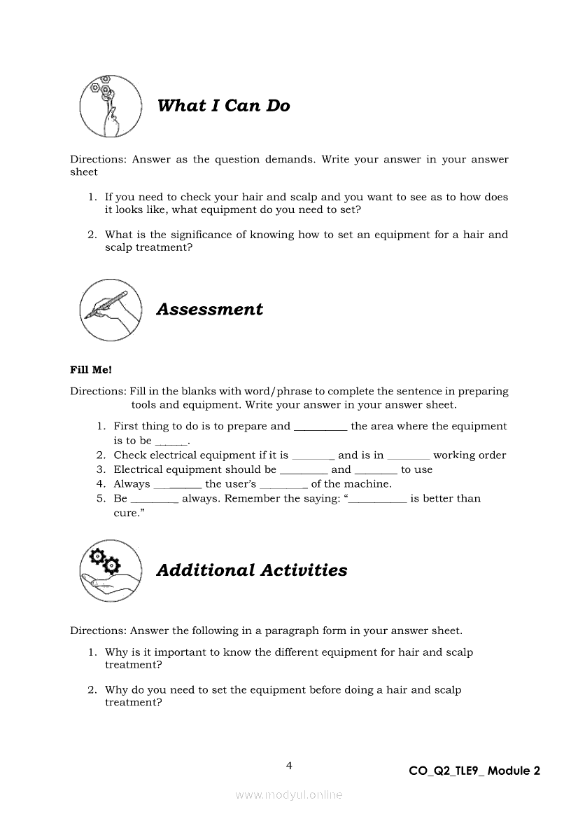 TLE 9 Quarter 2 – Module 2 Treat Hair and Scalp ConditionApr 22, 2021 Grade 9Xiaomi Redmi Watch 5 Active 2inch LCD Display Clear Calling 5ATM Waterproof Smart Watch for only ₱3,999 ₱1,200!. TLE 9RelatedTLE – H.E.- COOKERY Quarter 4 – Module 1: PREPARE SALAD DRESSING “Perform Mise en Place”TLE-AFA-AGRI CROP PRODUCTION Quarter 4 Module 1: Maintenance Activities of Farm FacilitiesTLE–IA-EIM Quarter 4 – Module 1a (Week 1-2) Philippine Electrical Code (PEC) provisions in Installing Electrical BoxesTLE-Animal Production Quarter 4 – Module 2: Marketing EggsTLE-IA-SMAW Quarter 4 – Module 3 (Week 5&6) LAYING OUT BEADS ON CARBON STEEL PLATES (LO1: STRIKE AN ARC)
