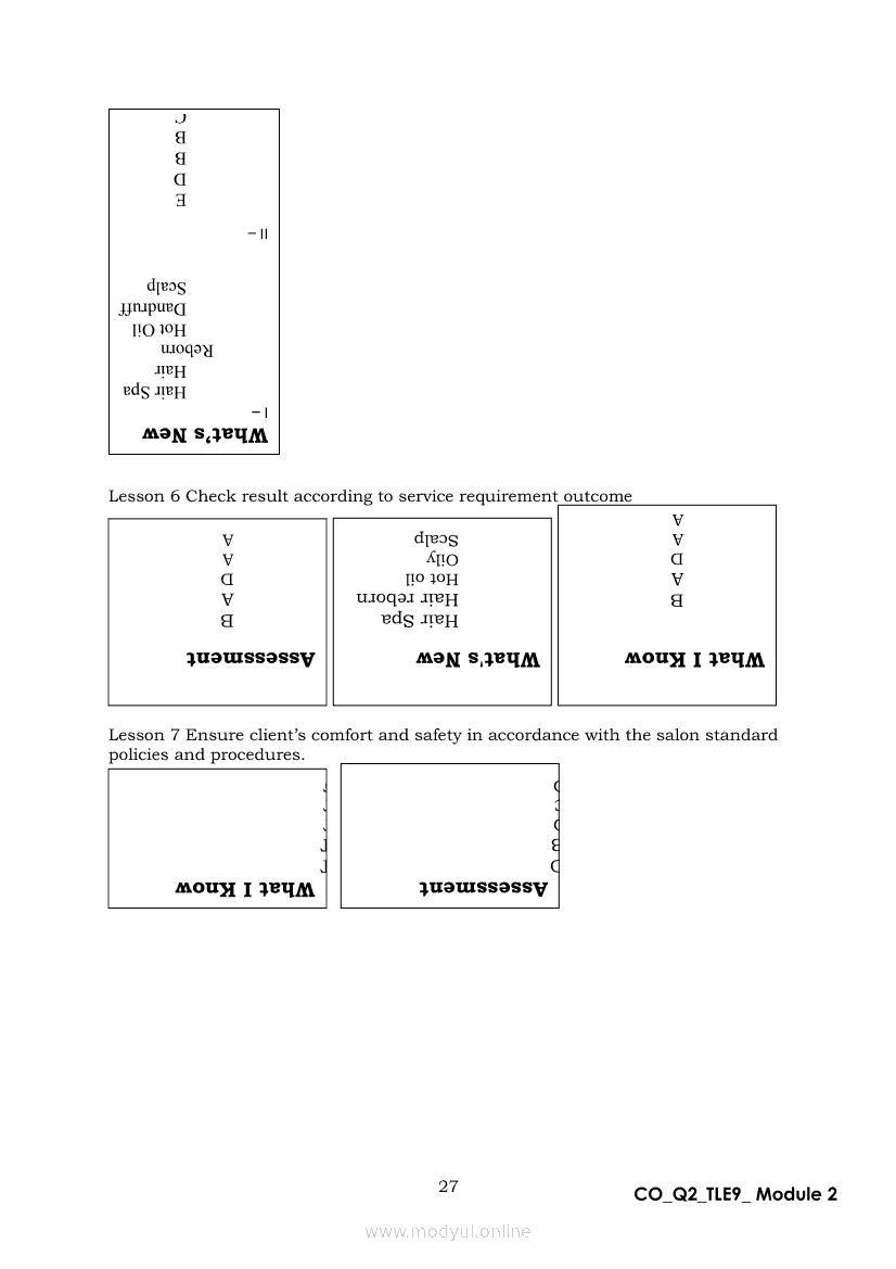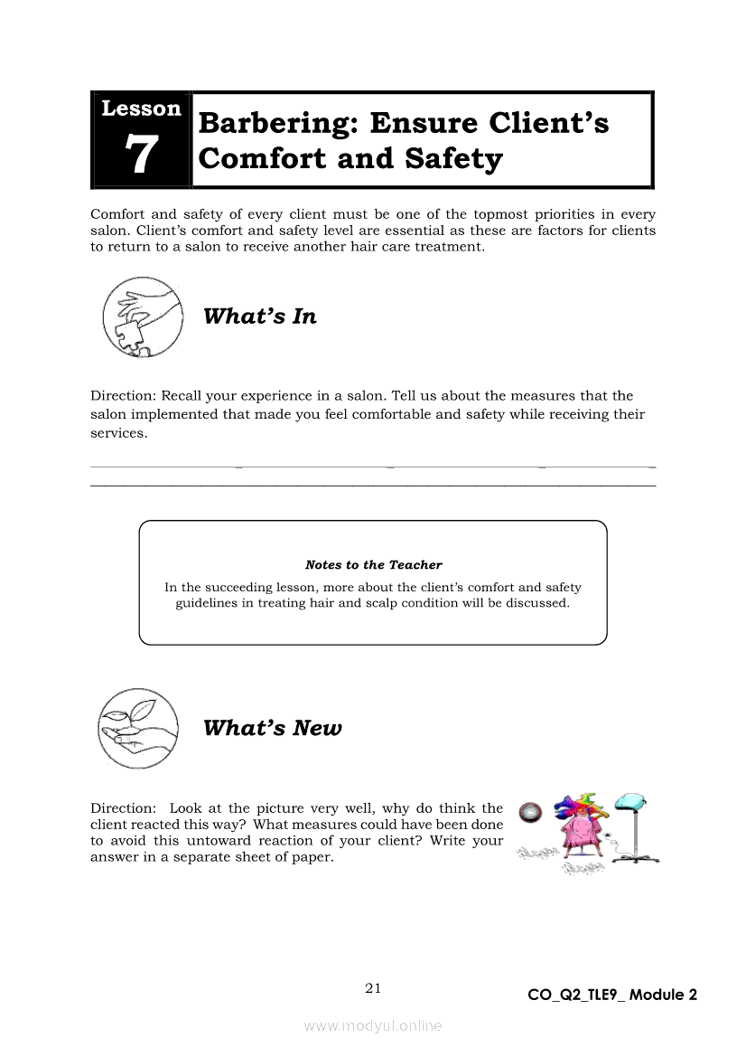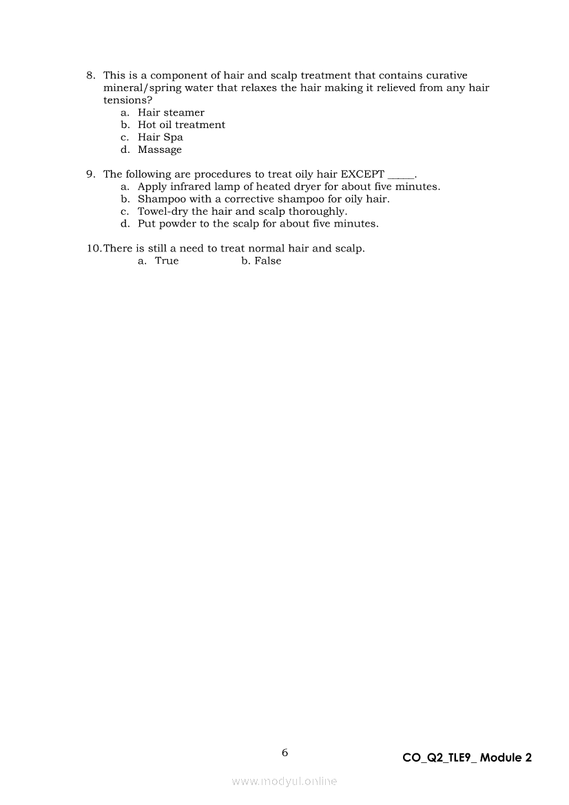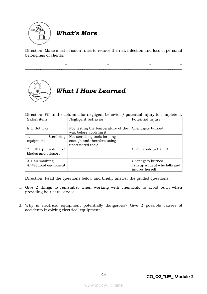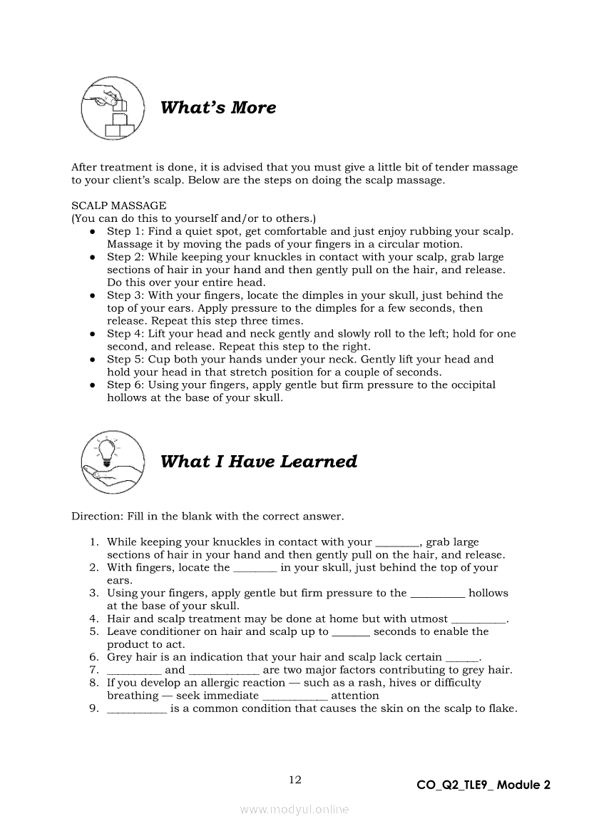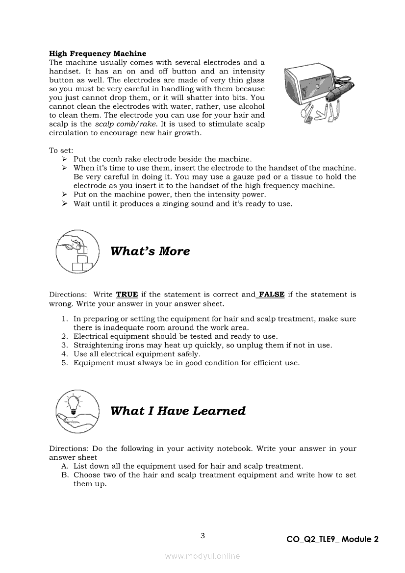TLE 9 Quarter 2 – Module 2 Treat Hair and Scalp ConditionApr 22, 2021 Grade 9Xiaomi Redmi Watch 5 Active 2inch LCD Display Clear Calling 5ATM Waterproof Smart Watch for only ₱3,999 ₱1,200!. TLE 9RelatedTLE – H.E.- COOKERY Quarter 4 – Module 1: PREPARE SALAD DRESSING “Perform Mise en Place”TLE-AFA-AGRI CROP PRODUCTION Quarter 4 Module 1: Maintenance Activities of Farm FacilitiesTLE–IA-EIM Quarter 4 – Module 1a (Week 1-2) Philippine Electrical Code (PEC) provisions in Installing Electrical BoxesTLE-Animal Production Quarter 4 – Module 2: Marketing EggsTLE-IA-SMAW Quarter 4 – Module 3 (Week 5&6) LAYING OUT BEADS ON CARBON STEEL PLATES (LO1: STRIKE AN ARC)